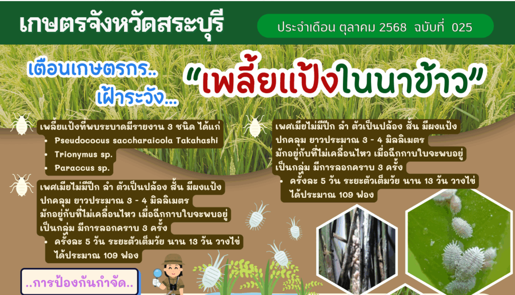 ข่าวส่งเสริมการเกษตร, ข่าวเตือนการระบาดศัตรูพืชเตือนเกษตรกร เฝ้าระวัง “เพลี้ยแป้งในนาข้าว” กลุ่มอารักขาพืช / 22/10/2025