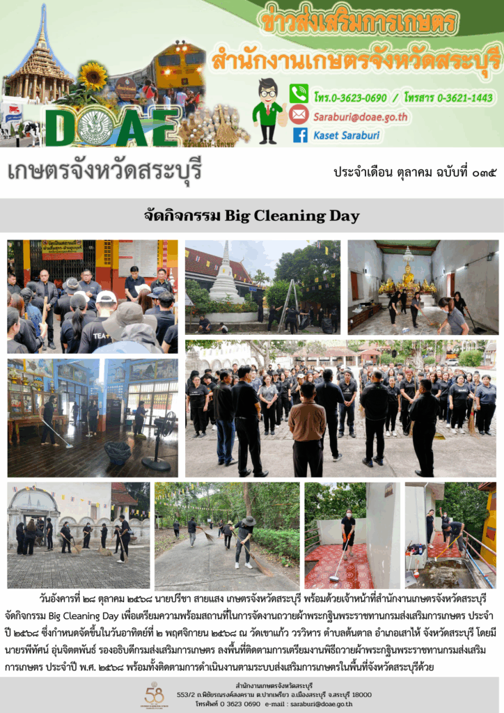 วันอังคารที่ ๒๘ ตุลาคม ๒๕๖๘ นายปรีชา สายแสง เกษตรจังหวัดสระบุรี พร้อมด้วยเจ้าหน้าที่ในสังกัดสำนักงานเกษตรจังหวัดสระบุรี จัดกิจกรรม Big Cleaning Day เพื่อเตรียมความพร้อมสถานที่ในการจัดงานถวายผ้าพระกฐินพระราชทานกรมส่งเสริมการเกษตร ประจำปี ๒๕๖๘ ซึ่งกำหนดจัดขึ้นในวันอาทิตย์ที่ ๒ พฤศจิกายน ๒๕๖๘ ณ วัดเขาแก้ว วรวิหาร ตำบลต้นตาล อำเภอเสาไห้ จังหวัดสระบุรี โดยมีนายรพีทัศน์ อุ่นจิตตพันธ์ รองอธิบดีกรมส่งเสริมการเกษตร ลงพื้นที่ติดตามการเตรียมงานพิธีถวายผ้าพระกฐินพระราชทานกรมส่งเสริมการเกษตร ประจำปี พ.ศ. ๒๕๖๘ พร้อมทั้งติดตามการดำเนินงานตามระบบส่งเสริมการเกษตรในพื้นที่จังหวัดสระบุรีด้วย