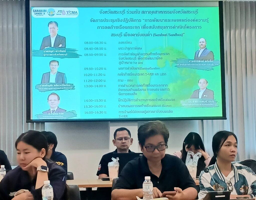 วันอังคารที่ ๑๘ พฤศจิกายน พ.ศ. ๒๕๖๘ จังหวัดสระบุรี ร่วมกับสภาอุตสาหกรรมจังหวัดสระบุรี จัดประชุมเชิงปฏิบัติการ “การพัฒนาศักยภาพและเผยแพร่องค์ความรู้การลดการปล่อยก๊าซเรือนกระจกเพื่อสนับสนุนการดำเนินงานโครงการสระบุรีแซนด์บ็อกซ์” โดยมี นายบัญชา เชาวรินทร์ ผู้ว่าราชการจังหวัดสระบุรี เป็นประธานการประชุม และปาฐกถาพิเศษ เพื่อให้ขับเคลื่อนการดำเนินโครงการสระบุรีแซนด์บ็อกซ์ เมืองต้นแบบคาร์บอนต่ำแห่งแรกของประเทศไทย เป็นไปอย่างมีประสิทธิภาพและประสิทธิผล ประกอบกับหัวหน้าคณะทำงานฯและเจ้าหน้าที่ที่เกี่ยวข้อง มีความรู้ความเข้าใจเกี่ยวกับการคำนวณปริมาณการลดก๊าซเรือนกระจกตามหลักเกณฑ์และมาตรฐานที่องค์การบริหารจัดการก๊าซเรือนกระจก (องค์การมหาชน) กำหนด