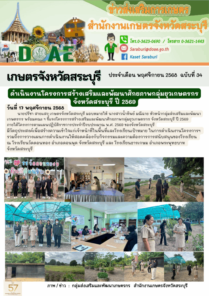 นายปรีชา สายแสง เกษตรจังหวัดสระบุรี มอบหมายให้ นางสาวน้ำทิพย์ มณีฉาย หัวหน้ากลุ่มส่งเสริมและพัฒนาเกษตรกร พร้อมคณะ ฯ ชี้แจงโครงการสร้างเสริมและพัฒนาศักยภาพกลุ่มยุวเกษตรกร จังหวัดสระบุรี ปี 2569 ภายใต้โครงการตามแผนปฏิบัติราชการประจำปีงบประมาณ พ.ศ. 2569 ของจังหวัดสระบุรี มีวัตถุประสงค์เพื่อสร้างความเข้าใจแก่เจ้าหน้าที่ในพื้นที่และโรงเรียนเป้าหมาย ในการดำเนินงานโครงการฯ รวมถึงการวางแผนการดำเนินงานให้สอดคล้องกับกิจกรรมและความต้องการการสนับสนุนของโรงเรียน ณ โรงเรียนวัดดอนทอง อำเภอดอนพุด จังหวัดสระบุรี และ โรงเรียนธารเกษม อำเภอพระพุทธบาท จังหวัดสระบุรี