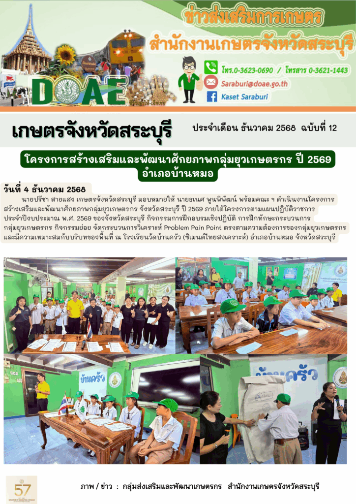 นายปรีชา สายแสง เกษตรจังหวัดสระบุรี มอบหมายให้ นายธเนศ พูนพิพัฒน์ พร้อมคณะ ฯ ดำเนินงานโครงการสร้างเสริมและพัฒนาศักยภาพกลุ่มยุวเกษตรกร จังหวัดสระบุรี ปี 2569 ภายใต้โครงการตามแผนปฏิบัติราชการประจำปีงบประมาณ พ.ศ. 2569 ของจังหวัดสระบุรี กิจกรรมการฝึกอบรมเชิงปฏิบัติ การฝึกทักษะกระบวนการกลุ่มยุวเกษตรกร กิจกรรมย่อย จัดกระบวนการวิเคราะห์ Problem Pain Point ตรงตามความต้องการของกลุ่มยุวเกษตรกรและมีความเหมาะสมกับบริบทของพื้นที่ ณ โรงเรียนวัดบ้านครัว (ซิเมนต์ไทยสงเคราะห์) อำเภอบ้านหมอ จังหวัดสระบุรี