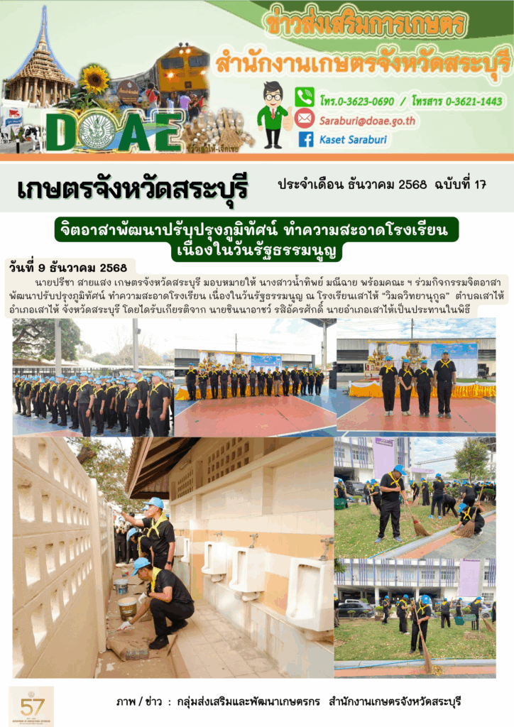 นายปรีชา สายแสง เกษตรจังหวัดสระบุรี มอบหมายให้ นางสาวน้ำทิพย์ มณีฉาย พร้อมคณะ ฯ ร่วมกิจกรรมจิตอาสาพัฒนาปรับปรุงภูมิทัศน์ ทำความสะอาดโรงเรียน เนื่องในวันรัฐธรรมนูญ ณ โรงเรียนเสาไห้ “วิมลวิทยานุกูล” ตำบลเสาไห้ อำเภอเสาไห้ จังหวัดสระบุรี โดยไดรับเกียรติจาก นายชินนาอาชว์ รสิอัครศักดิ์ นายอำเภอเสาไห้เป็นประทานในพิธี