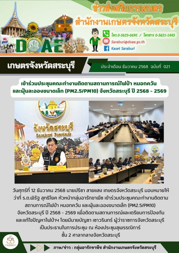 วันศุกร์ที่ 12 ธันวาคม 2568 นายปรีชา สายแสง เกษตรจังหวัดสระบุรี มอบหมายให้ว่าที่ ร.ต.พิรัฐ สุทธิโยค หัวหน้ากลุ่มอารักขาพืช เข้าร่วมประชุมคณะทำงานติดตามสถานการณ์ไฟป่า หมอกควัน และฝุ่นละอองขนาดเล็ก (PM2.5/PM10) จังหวัดสระบุรี ปี 2568 – 2569 เพื่อติดตามสถานการณ์และเตรียมการป้องกันและแก้ไขปัญหาไฟป่าฯ โดยมีนายบัญชา เชาวรินทร์ ผู้ว่าราชการจังหวัดสระบุรี เป็นประธานในการประชุม ณ ห้องประชุมสุพรรณิการ์ ชั้น 2 ศาลากลางจังหวัดสระบุรี