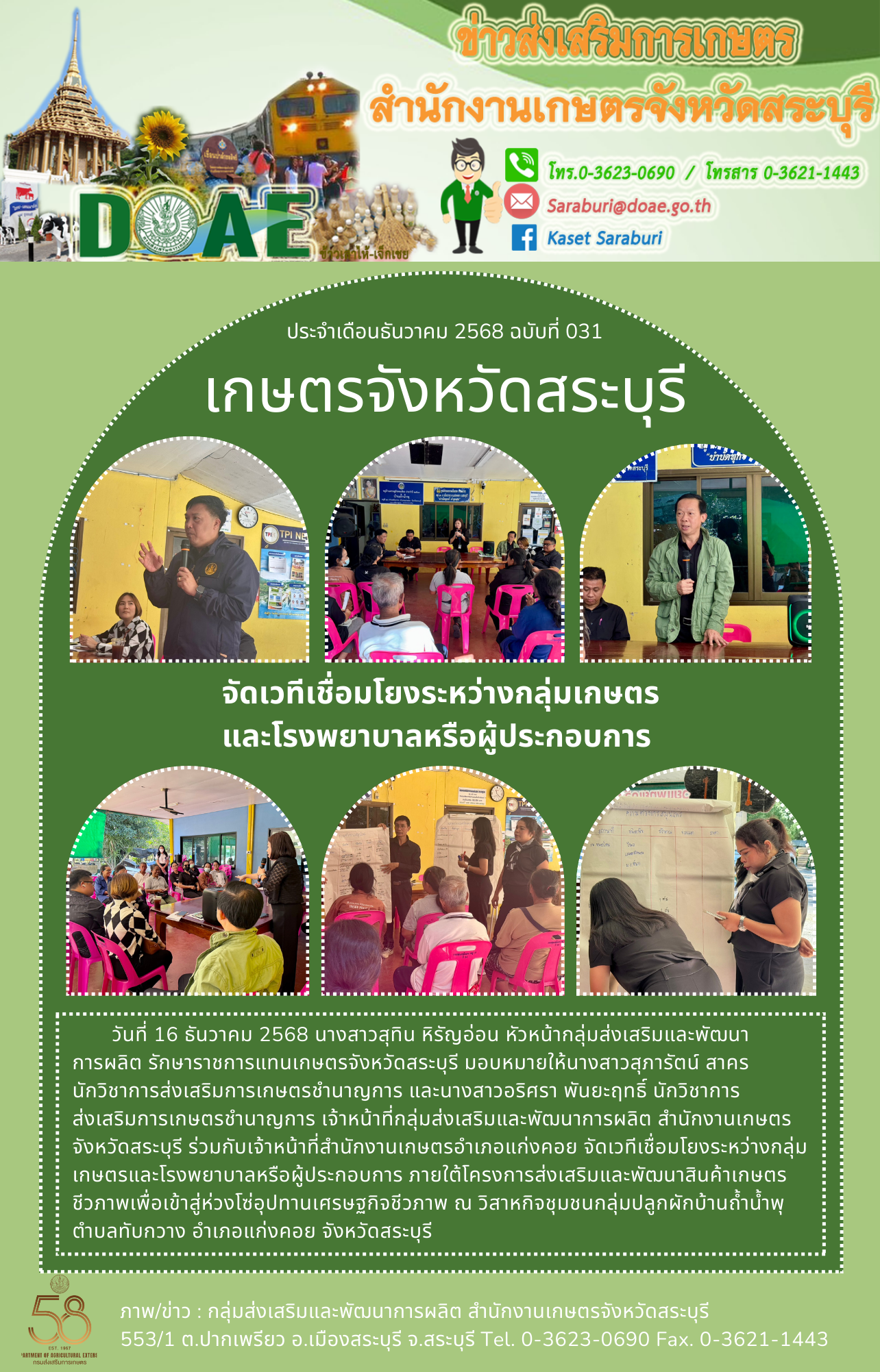 วันที่ 16 ธันวาคม 2568 นางสาวสุทิน หิรัญอ่อน หัวหน้ากลุ่มส่งเสริมและพัฒนาการผลิต รักษาราชการแทนเกษตรจังหวัดสระบุรี มอบหมายให้นางสาวสุภารัตน์ สาคร นักวิชาการส่งเสริมการเกษตรชำนาญการ และนางสาวอริศรา พันยะฤทธิ์ นักวิชาการส่งเสริมการเกษตรชำนาญการ เจ้าหน้าที่กลุ่มส่งเสริมและพัฒนาการผลิต สำนักงานเกษตรจังหวัดสระบุรี ร่วมกับเจ้าหน้าที่สำนักงานเกษตรอำเภอแก่งคอย จัดเวทีเชื่อมโยงระหว่างกลุ่มเกษตรและโรงพยาบาลหรือผู้ประกอบการ ภายใต้โครงการส่งเสริมและพัฒนาสินค้าเกษตรชีวภาพเพื่อเข้าสู่ห่วงโซ่อุปทานเศรษฐกิจชีวภาพ ณ วิสาหกิจชุมชนกลุ่มปลูกผักบ้านถ้ำน้ำพุ ตำบลทับกวาง อำเภอแก่งคอย จังหวัดสระบุรี