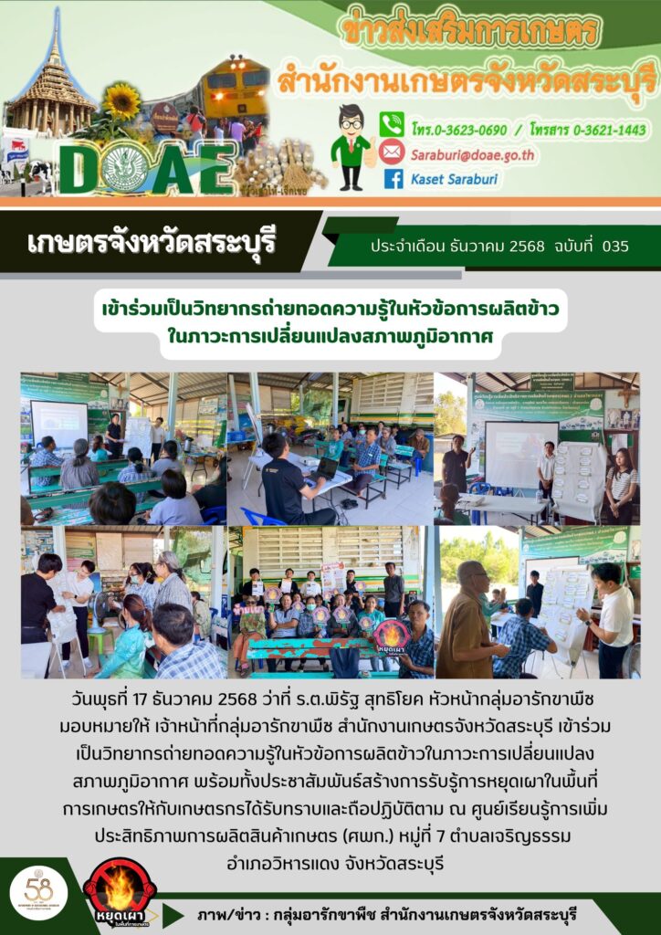 วันพุธที่ 17 ธันวาคม 2568 ว่าที่ ร.ต.พิรัฐ สุทธิโยค หัวหน้ากลุ่มอารักขาพืช มอบหมายให้ เจ้าหน้าที่กลุ่มอารักขาพืช สำนักงานเกษตรจังหวัดสระบุรี เข้าร่วมเป็นวิทยากรถ่ายทอดความรู้ในหัวข้อการผลิตข้าวในภาวะการเปลี่ยนแปลงสภาพภูมิอากาศ พร้อมทั้งประชาสัมพันธ์สร้างการรับรู้การหยุดเผาในพื้นที่การเกษตรให้กับเกษตรกรได้รับทราบและถือปฏิบัติตาม ณ ศูนย์เรียนรู้การเพิ่มประสิทธิภาพการผลิตสินค้าเกษตร (ศพก.) หมู่ที่ 7 ตำบลเจริญธรรม อำเภอวิหารแดง จังหวัดสระบุรี