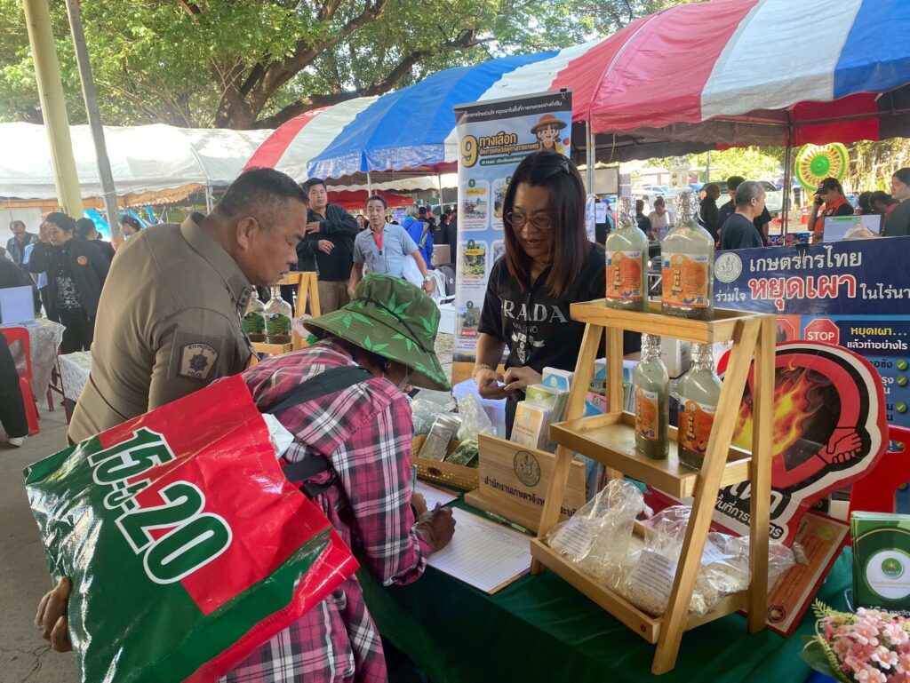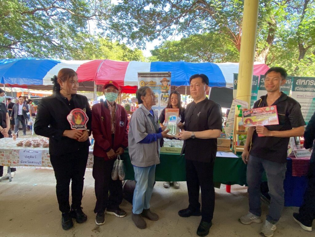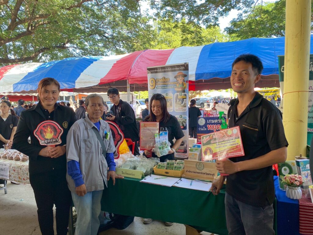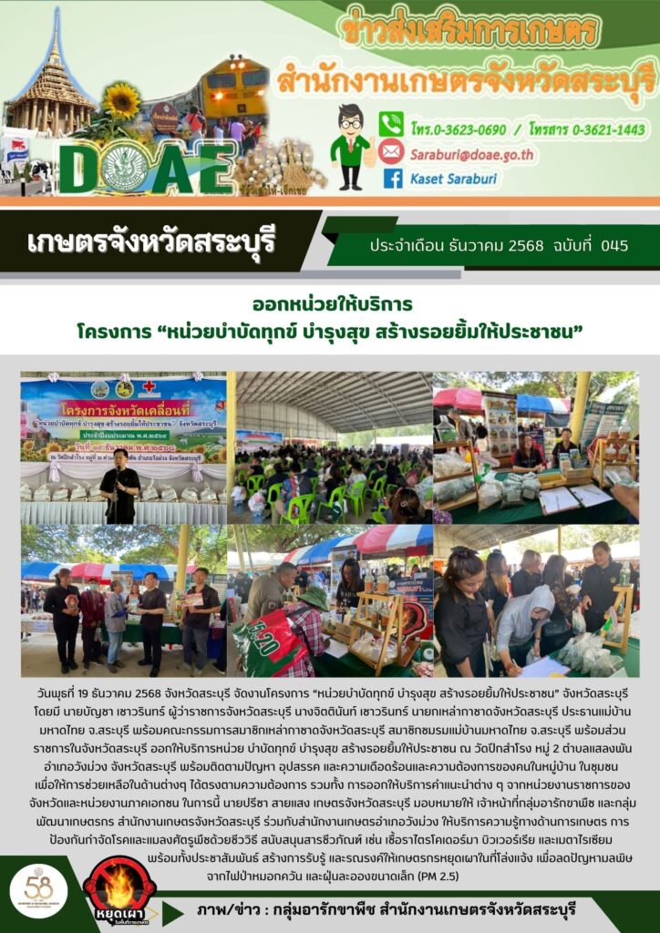 วันพุธที่ 19 ธันวาคม 2568 จังหวัดสระบุรี จัดงานโครงการ “หน่วยบำบัดทุกข์ บำรุงสุข สร้างรอยยิ้มให้ประชาชน” จังหวัดสระบุรี โดยมี นายบัญชา เชาวรินทร์ ผู้ว่าราชการจังหวัดสระบุรี นางจิตตินันท์ เชาวรินทร์ นายกเหล่ากาชาดจังหวัดสระบุรี ประธานแม่บ้านมหาดไทย จ.สระบุรี พร้อมคณะกรรมการสมาชิกเหล่ากาชาดจังหวัดสระบุรี สมาชิกชมรมแม่บ้านมหาดไทย จ.สระบุรี พร้อมส่วนราชการในจังหวัดสระบุรี ออกให้บริการหน่วย บำบัดทุกข์ บำรุงสุข สร้างรอยยิ้มให้ประชาชน ณ วัดปึกสำโรง หมู่ 2 ตำบลแสลงพัน อำเภอวังม่วง จังหวัดสระบุรี พร้อมติดตามปัญหา อุปสรรค และความเดือดร้อนและความต้องการของคนในหมู่บ้าน ในชุมชน เพื่อให้การช่วยเหลือในด้านต่างๆ ได้ตรงตามความต้องการ รวมทั้ง การออกให้บริการคำแนะนำต่าง ๆ จากหน่วยงานราชการของจังหวัดและหน่วยงานภาคเอกชน ในการนี้ นายปรีชา สายแสง เกษตรจังหวัดสระบุรี มอบหมายให้ เจ้าหน้าที่กลุ่มอารักขาพืช และกลุ่มพัฒนาเกษตรกร สำนักงานเกษตรจังหวัดสระบุรี ร่วมกับสำนักงานเกษตรอำเภอวังม่วง ให้บริการความรู้ทางด้านการเกษตร การป้องกันกำจัดโรคและแมลงศัตรูพืชด้วยชีววิธี สนับสนุนสารชีวภัณฑ์ เช่น เชื้อราไตรโคเดอร์มา บิวเวอร์เรีย และเมตาไรเซียม พร้อมทั้งประชาสัมพันธ์ สร้างการรับรู้ และรณรงค์ให้เกษตรกรหยุดเผาในที่โล่งแจ้ง เพื่อลดปัญหามลพิษจากไฟป่าหมอกควัน และฝุ่นละอองขนาดเล็ก (PM 2.5)
