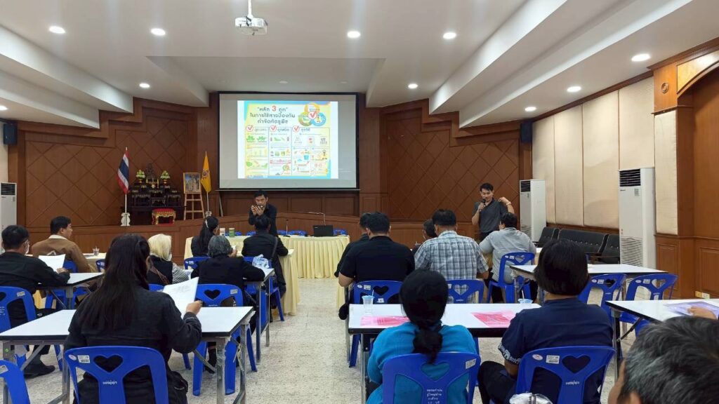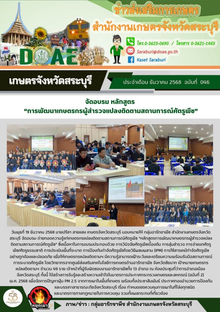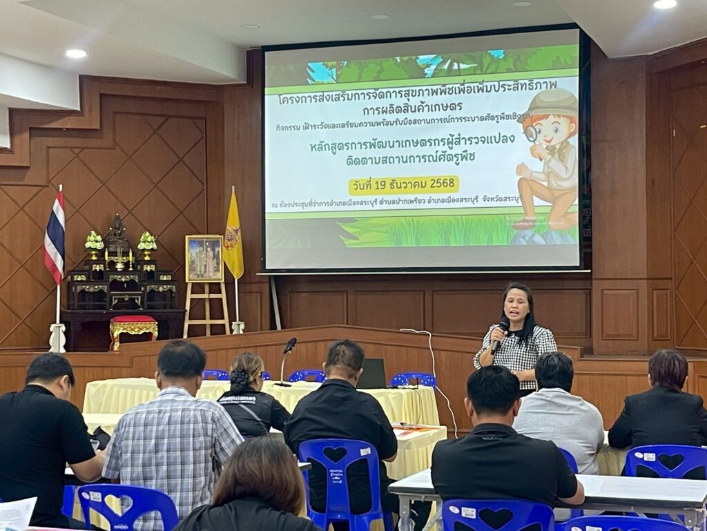 วันพุธที่ 19 ธันวาคม 2568 นายปรีชา สายแสง เกษตรจังหวัดสระบุรี มอบหมายให้ กลุ่มอารักขาพืช สำนักงานเกษตรจังหวัดสระบุรี จัดอบรม ถ่ายทอดความรู้แก่เกษตรกรแปลงติดตามสถานการณ์ศัตรูพืช “หลักสูตรการพัฒนาเกษตรกรผู้สำรวจแปลงติดตามสถานการณ์ศัตรูพืช” ซึ่งเนื้อหาในการอบรมประกอบด้วย การวินิจฉัยศัตรูพืชเบื้องต้น การสุ่มสำรวจ การจำแนกศัตรูพืช/ศัตรูธรรมชาติ การประเมินพื้นที่ระบาด การป้องกันกำจัดศัตรูพืชโดยวิธีผสมผสาน (IPM) การใช้สารเคมีกำจัดศัตรูพืช อย่างถูกต้องและปลอดภัย เพื่อให้เกษตรกรแปลงติดตามฯ มีความรู้สามารถเฝ้าระวังและเตรียมความพร้อมรับมือสถานการณ์การระบาดศัตรูพืช โดยวิทยากรจากศูนย์ส่งเสริมเทคโนโลยีการเกษตรด้านอารักขาพืช จังหวัดชัยนาท เป้าหมายเกษตรกร