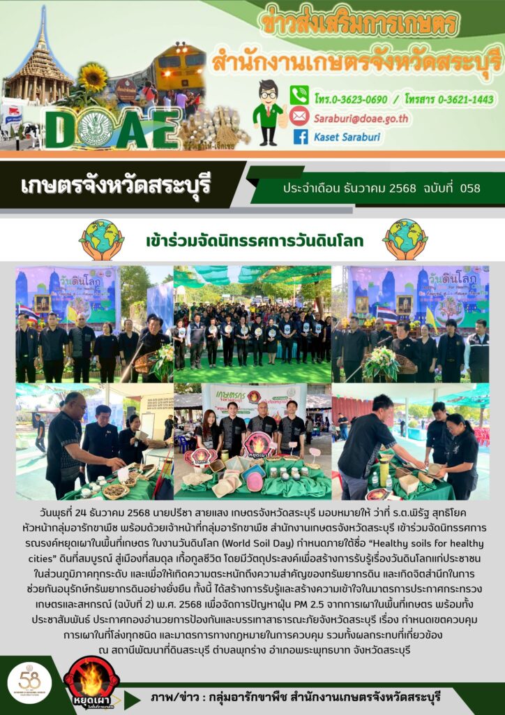 วันพุธที่ 24 ธันวาคม 2568 นายปรีชา สายแสง เกษตรจังหวัดสระบุรี มอบหมายให้ ว่าที่ ร.ต.พิรัฐ สุทธิโยค หัวหน้ากลุ่มอารักขาพืช พร้อมด้วยเจ้าหน้าที่กลุ่มอารักขาพืช สำนักงานเกษตรจังหวัดสระบุรี เข้าร่วมจัดนิทรรศการรณรงค์หยุดเผาในพื้นที่เกษตร ในงานวันดินโลก (World Soil Day) กำหนดภายใต้ชื่อ “Healthy soils for healthy cities” ดินที่สมบูรณ์ สู่เมืองที่สมดุล เกื้อกูลชีวิต โดยมีวัตถุประสงค์เพื่อสร้างการรับรู้เรื่องวันดินโลกแก่ประชาชนในส่วนภูมิภาคทุกระดับ และเพื่อให้เกิดความตระหนักถึงความสำคัญของทรัพยากรดิน และเกิดจิตสำนึกในการช่วยกันอนุรักษ์ทรัพยากรดินอย่างยั่งยืน ทั้งนี้ ได้สร้างการรับรู้และสร้างความเข้าใจในมาตรการประกาศกระทรวงเกษตรและสหกรณ์ (ฉบับที่ 2) พ.ศ. 2568 เพื่อจัดการปัญหาฝุ่น PM 2.5 จากการเผาในพื้นที่เกษตร พร้อมทั้งประชาสัมพันธ์ ประกาศกองอำนวยการป้องกันและบรรเทาสาธารณะภัยจังหวัดสระบุรี เรื่อง กำหนดเขตควบคุมการเผาในที่โล่งทุกชนิด และมาตรการทางกฎหมายในการควบคุม รวมทั้งผลกระทบที่เกี่ยวข้อง ณ สถานีพัฒนาที่ดินสระบุรี ตำบลพุกร่าง อำเภอพระพุทธบาท จังหวัดสระบุรี