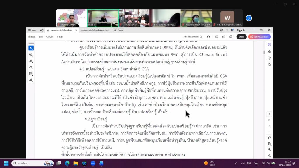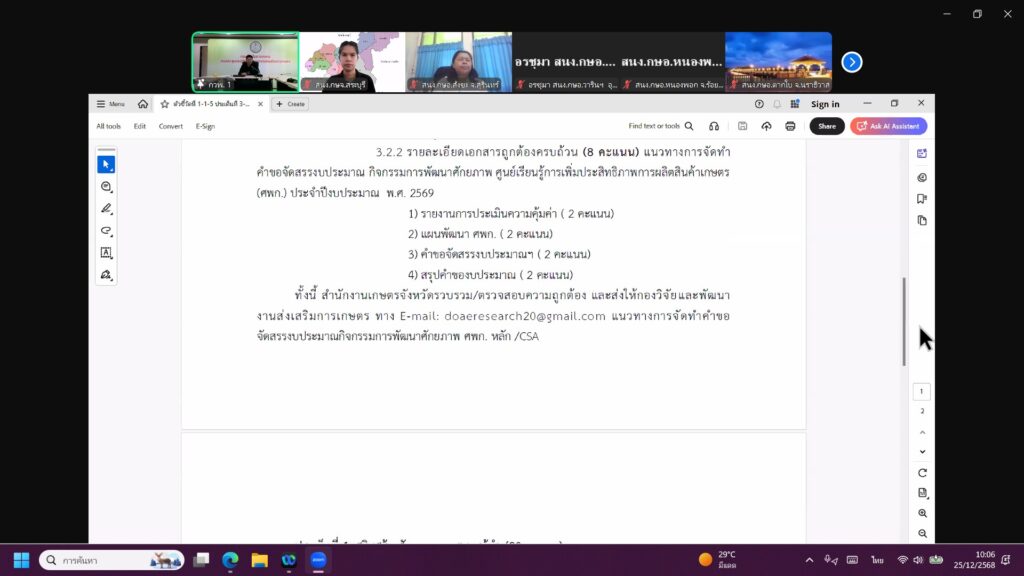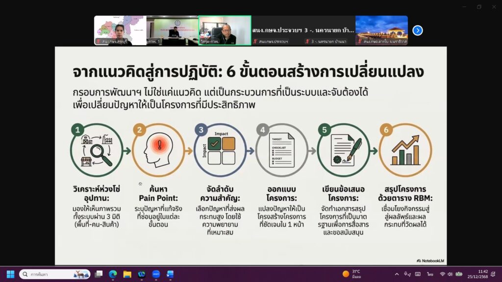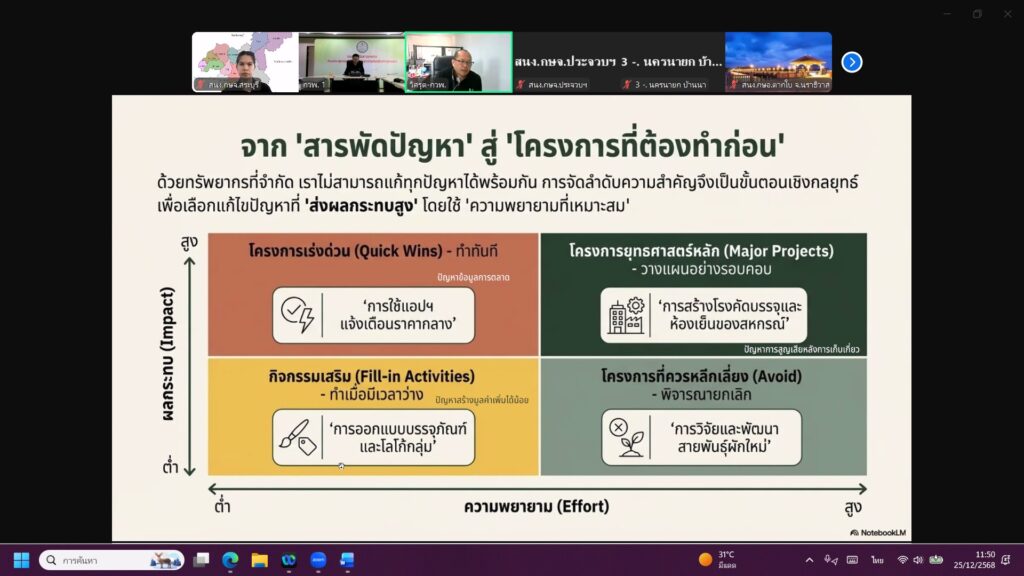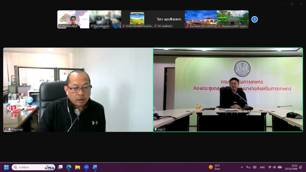วันพฤหัสบดีที่ ๒๕ ธันวาคม ๒๕๖๘ นายปรีชา สายแสง เกษตรจังหวัดสระบุรี มอบหมายให้นางสาวเบญญทิพย์ ส้มม่วง นักวิชาการส่งเสริมการเกษตรชำนาญการ กลุ่มยุทธศาสตร์และสารสนเทศ เข้าร่วมการประชุมชี้แจงแนวทางการจัดทำตัวชี้วัดประเด็นกรอบการพัฒนาการเกษตรเชิงพื้นที่ และการพัฒนาศักภาพ ศพก. ประจำปีงบประมาณ ๒๕๖๙ ผ่านระบบ Zoom Meeting จัดโดย กองวิจัยและพัฒนางานส่งเสริมการเกษตร โดยมี นายเด่นพงษ์ เวียงศรีพนาวัลย์ ผู้อำนวยการกลุ่มพัฒนาระบบงานส่งเสริมการเกษตร เป็นประธานในการประชุม และร่วมชี้แจงแนวทางการ จัดทำตัวชี้วัดการพัฒนา ศพก. พร้อมนายวิศรุต ตุ้ยศักดา ผู้อำนวยการกลุ่มพัฒนาการมีส่วนร่วมของภาคี และเครือข่าย ร่วมชี้แจงแนวทางการจัดทำ ตัวชี้วัดในประเด็นกรอบการพัฒนาการเกษตรเชิงพื้นที่ เพื่อให้การดำเนินงานเป็นไปอย่างมีประสิทธิภาพ ตรงตามวัตถุประสงค์