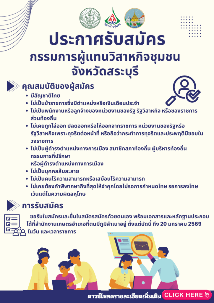 ประกาศรับสมัคร กรรมการผู้แทนวิสาหกิจชุมชนจังหวัดสระบุรีBy admin_doae / 29/12/2025 ประกาศรับสมัครกรรมการผู้แทนวิสาหกิขชุมชนดาวน์โหลด แบบฟอร์มใบสมัคร (PDF)ดาวน์โหลด แบบฟอร์มใบสมัคร (Word)ดาวน์โหลด