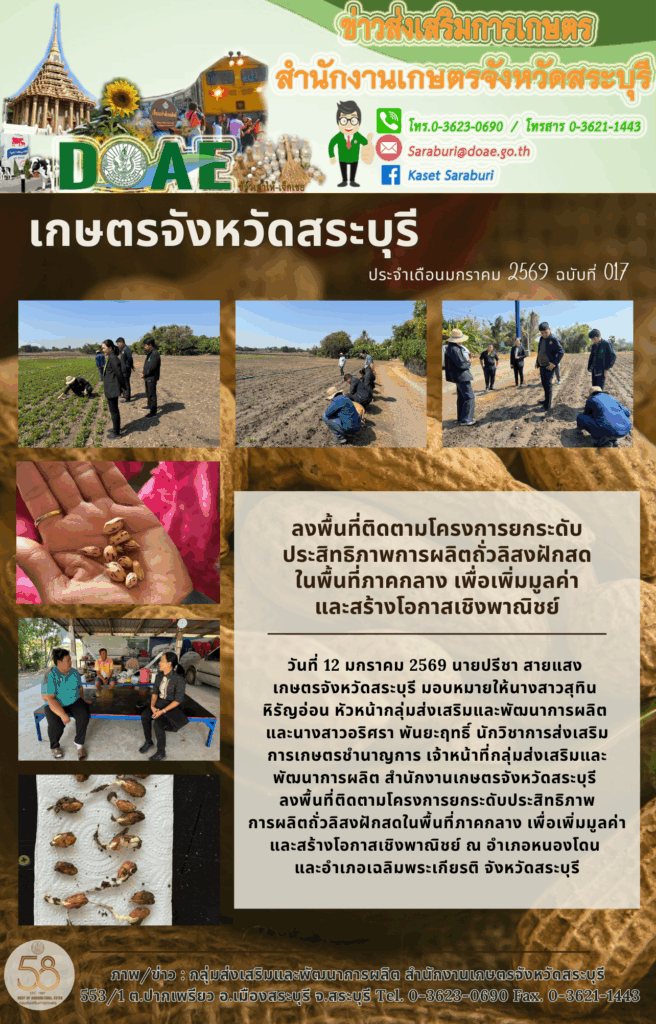 วันที่ 12 มกราคม 2569 นายปรีชา สายแสง เกษตรจังหวัดสระบุรี มอบหมายให้นางสาวสุทิน หิรัญอ่อน หัวหน้ากลุ่มส่งเสริมและพัฒนาการผลิต และนางสาวอริศรา พันยะฤทธิ์ นักวิชาการส่งเสริมการเกษตรชำนาญการ เจ้าหน้าที่กลุ่มส่งเสริมและพัฒนาการผลิต สำนักงานเกษตรจังหวัดสระบุรี ลงพื้นที่ติดตามโครงการยกระดับประสิทธิภาพการผลิตถั่วลิสงฝักสดในพื้นที่ภาคกลาง เพื่อเพิ่มมูลค่าและสร้างโอกาสเชิงพาณิชย์ ณ อำเภอหนองโดน และอำเภอเฉลิมพระเกียรติ จังหวัดสระบุรี