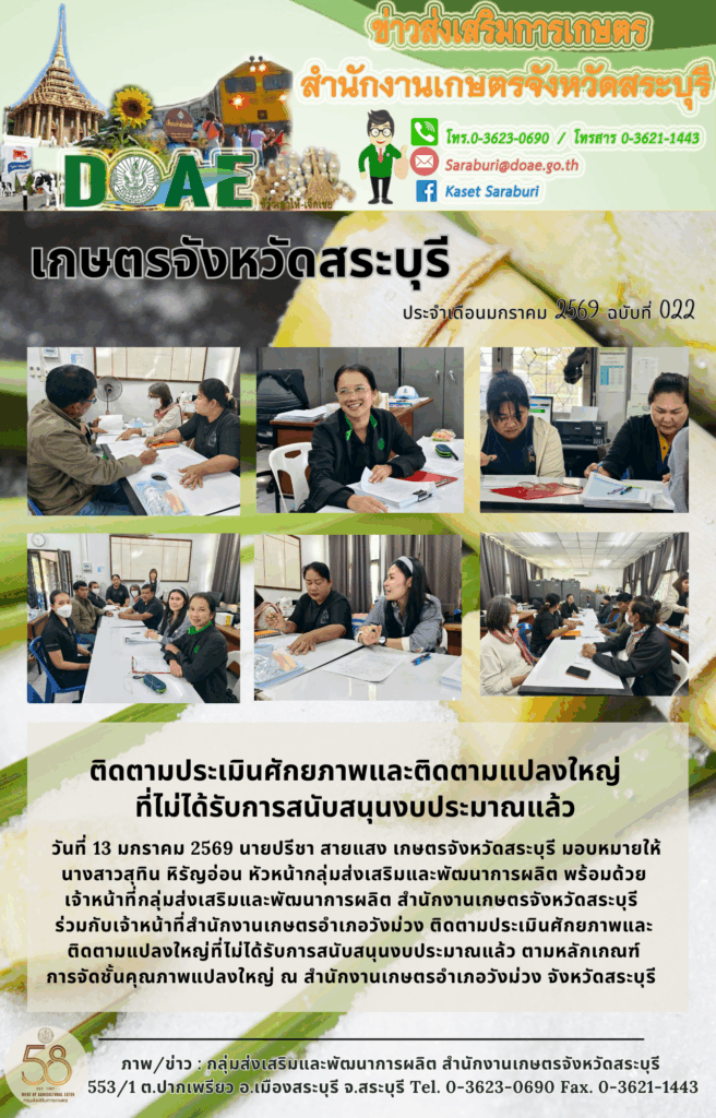 วันที่ 13 มกราคม 2569 นายปรีชา สายแสง เกษตรจังหวัดสระบุรี มอบหมายให้ นางสาวสุทิน หิรัญอ่อน หัวหน้ากลุ่มส่งเสริมและพัฒนาการผลิต พร้อมด้วยเจ้าหน้าที่กลุ่มส่งเสริมและพัฒนาการผลิต สำนักงานเกษตรจังหวัดสระบุรี ร่วมกับเจ้าหน้าที่สำนักงานเกษตรอำเภอวังม่วง ติดตามประเมินศักยภาพและติดตามแปลงใหญ่ที่ไม่ได้รับการสนับสนุนงบประมาณแล้ว ตามหลักเกณฑ์การจัดชั้นคุณภาพแปลงใหญ่ ณ สำนักงานเกษตรอำเภอวังม่วง จังหวัดสระบุรี