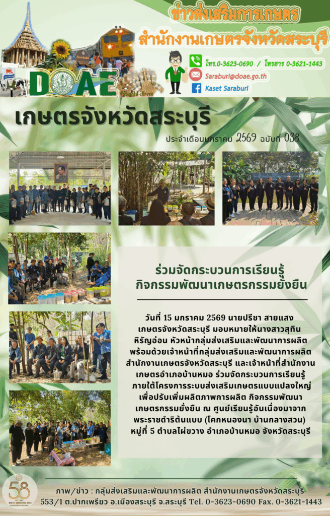 วันที่ 15 มกราคม 2569 นายปรีชา สายแสงเกษตรจังหวัดสระบุรี มอบหมายให้นางสาวสุทิน หิรัญอ่อน หัวหน้ากลุ่มส่งเสริมและพัฒนาการผลิต พร้อมด้วยเจ้าหน้าที่กลุ่มส่งเสริมและพัฒนาการผลิต สำนักงานเกษตรจังหวัดสระบุรี และเจ้าหน้าที่สำนักงานเกษตรอำเภอบ้านหมอ ร่วมจัดกระบวนการเรียนรู้ ภายใต้โครงการระบบส่งเสริมเกษตรแบบแปลงใหญ่เพื่อปรับเพิ่มผลิตภาพการผลิต กิจกรรมพัฒนาเกษตรกรรมยั่งยืน ณ ศูนย์เรียนรู้อันเนื่องมาจากพระราชดำริต้นแบบ (โคกหนองนา บ้านกลางสวน) หมู่ที่ 5 ตำบลไผ่ขวาง อำเภอบ้านหมอ จังหวัดสระบุรี