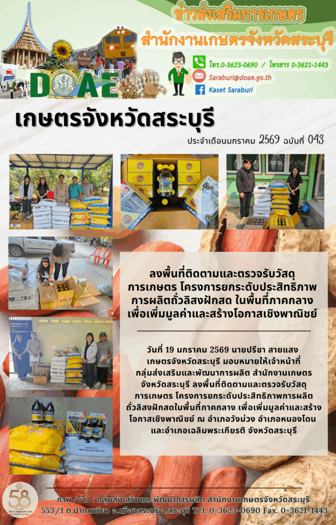 วันที่ 19 มกราคม 2569 นายปรีชา สายแสง เกษตรจังหวัดสระบุรี มอบหมายให้เจ้าหน้าที่กลุ่มส่งเสริมและพัฒนาการผลิต สำนักงานเกษตรจังหวัดสระบุรี ลงพื้นที่ติดตามและตรวจรับวัสดุการเกษตร โครงการยกระดับประสิทธิภาพการผลิตถั่วลิสงฝักสดในพื้นที่ภาคกลาง เพื่อเพิ่มมูลค่าและสร้างโอกาสเชิงพาณิชย์ ณ อำเภอวังม่วง อำเภอหนองโดน และอำเภอเฉลิมพระเกียรติ จังหวัดสระบุรี