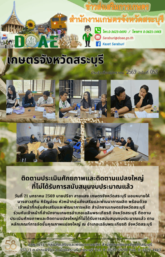 วันที่ 21 มกราคม 2569 นายปรีชา สายแสง เกษตรจังหวัดสระบุรี มอบหมายให้ นางสาวสุทิน หิรัญอ่อน หัวหน้ากลุ่มส่งเสริมและพัฒนาการผลิต พร้อมด้วยเจ้าหน้าที่กลุ่มส่งเสริมและพัฒนาการผลิต สำนักงานเกษตรจังหวัดสระบุรี ร่วมกับเจ้าหน้าที่สำนักงานเกษตรอำเภอเฉลิมพระเกียรติ จังหวัดสระบุรี ติดตามประเมินศักยภาพและติดตามแปลงใหญ่ที่ไม่ได้รับการสนับสนุนงบประมาณแล้ว ตามหลักเกณฑ์การจัดชั้นคุณภาพแปลงใหญ่ ณ อำเภอเฉลิมพระเกียรติ จังหวัดสระบุรี