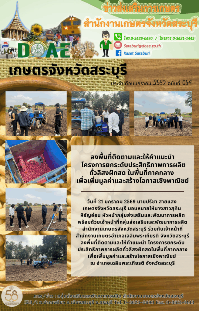 วันที่ 21 มกราคม 2569 นายปรีชา สายแสงเกษตรจังหวัดสระบุรี มอบหมายให้นางสาวสุทิน หิรัญอ่อน หัวหน้ากลุ่มส่งเสริมและพัฒนาการผลิต พร้อมด้วยเจ้าหน้าที่กลุ่มส่งเสริมและพัฒนาการผลิต สำนักงานเกษตรจังหวัดสระบุรี ร่วมกับเจ้าหน้าที่สำนักงานเกษตรอำเภอเฉลิมพระเกียรติ จังหวัดสระบุรี ลงพื้นที่ติดตามและให้คำแนะนำ โครงการยกระดับประสิทธิภาพการผลิตถั่วลิสงฝักสดในพื้นที่ภาคกลาง เพื่อเพิ่มมูลค่าและสร้างโอกาสเชิงพาณิชย์ ณ อำเภอเฉลิมพระเกียรติ จังหวัดสระบุรี
