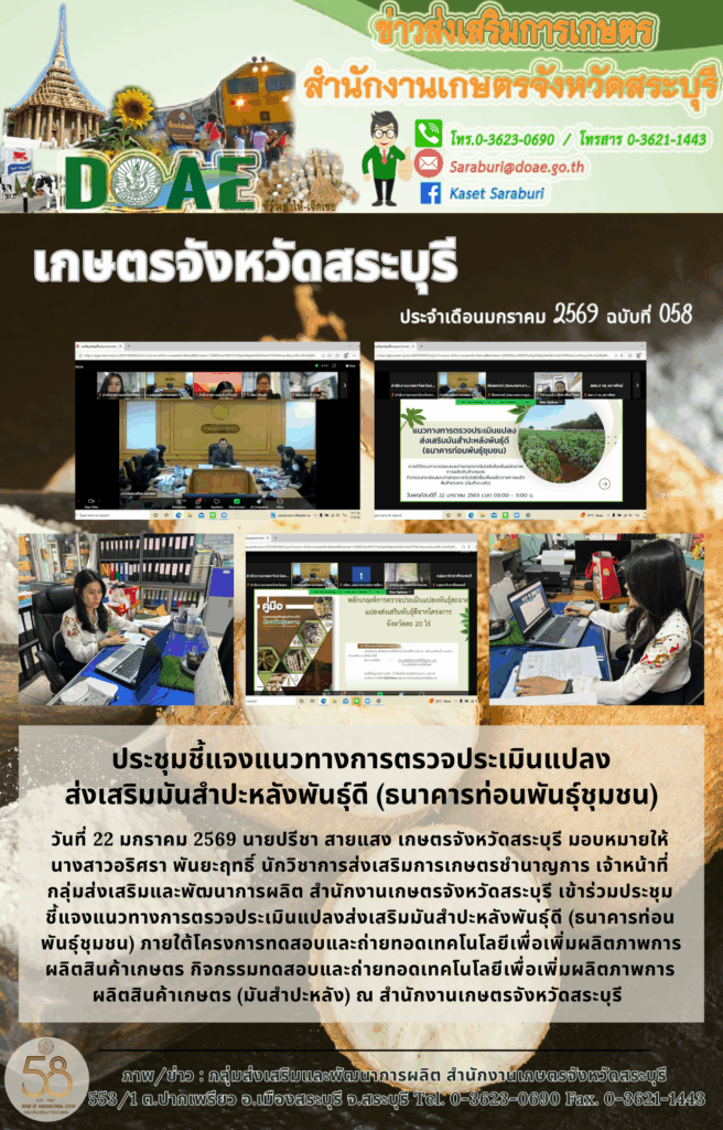 วันที่ 22 มกราคม 2569 นายปรีชา สายแสง เกษตรจังหวัดสระบุรี มอบหมายให้นางสาวอริศรา พันยะฤทธิ์ นักวิชาการส่งเสริมการเกษตรชำนาญการ เจ้าหน้าที่กลุ่มส่งเสริมและพัฒนาการผลิต สำนักงานเกษตรจังหวัดสระบุรี เข้าร่วมประชุมชี้แจงแนวทางการตรวจประเมินแปลงส่งเสริมมันสำปะหลังพันธุ์ดี (ธนาคารท่อนพันธุ์ชุมชน) ภายใต้โครงการทดสอบและถ่ายทอดเทคโนโลยีเพื่อเพิ่มผลิตภาพการผลิตสินค้าเกษตร กิจกรรมทดสอบและถ่ายทอดเทคโนโลยีเพื่อเพิ่มผลิตภาพการผลิตสินค้าเกษตร (มันสำปะหลัง) ณ สำนักงานเกษตรจังหวัดสระบุรี