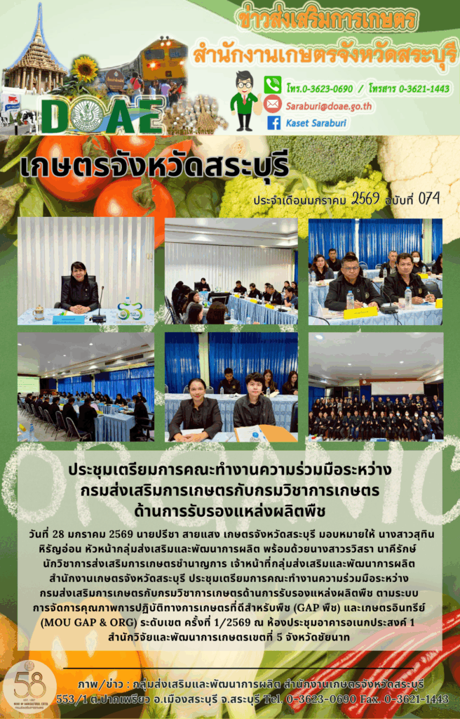 วันที่ 28 มกราคม 2569 นายปรีชา สายแสง เกษตรจังหวัดสระบุรี มอบหมายให้ นางสาวสุทิน หิรัญอ่อน หัวหน้ากลุ่มส่งเสริมและพัฒนาการผลิต พร้อมด้วยนางสาวรวิสรา นาคีรักษ์ นักวิชาการส่งเสริมการเกษตรชำนาญการ เจ้าหน้าที่กลุ่มส่งเสริมและพัฒนาการผลิต สำนักงานเกษตรจังหวัดสระบุรี ประชุมเตรียมการคณะทำงานความร่วมมือระหว่างกรมส่งเสริมการเกษตรกับกรมวิชาการเกษตรด้านการรับรองแหล่งผลิตพืช ตามระบบการจัดการคุณภาพการปฏิบัติทางการเกษตรที่ดีสำหรับพืช (GAP พืช) และเกษตรอินทรีย์ (MOU GAP & ORG) ระดับเขต ครั้งที่ 1/2569 ณ ห้องประชุมอาคารอเนกประสงค์ 1 สำนักวิจัยและพัฒนาการเกษตรเขตที่ 5 จังหวัดชัยนาท