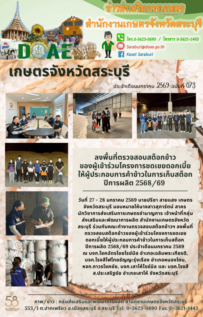 วันที่ 27 – 28 มกราคม 2569 นายปรีชา สายแสง เกษตรจังหวัดสระบุรี มอบหมายให้นางสาวสุภารัตน์ สาคร นักวิชาการส่งเสริมการเกษตรชำนาญการ เจ้าหน้าที่กลุ่มส่งเสริมและพัฒนาการผลิต สำนักงานเกษตรจังหวัดสระบุรี ร่วมกับคณะทำงานตรวจสอบสต็อกข้าวฯ ลงพื้นที่ตรวจสอบสต็อกข้าวของผู้เข้าร่วมโครงการชดเชpดอกเบี้ยให้ผู้ประกอบการค้าข้าวในการเก็บสต็อก ปีการผลิต 2568/69 ประจำเดือนมกราคม 2569 ณ บจก.โชคฉัตรไชยไรซ์มิล อำเภอเฉลิมพระเกียรติ, บจก.โรงสีไฟไทยธัญญะรุ่งเรือง อำเภอหนองโดน, หจก.ถาวรโชคชัย, บจก.เสาไห้ไรซ์มิล และ บจก.โรงสี ส.ประเสริฐชัย อำเภอเสาไห้ จังหวัดสระบุรี