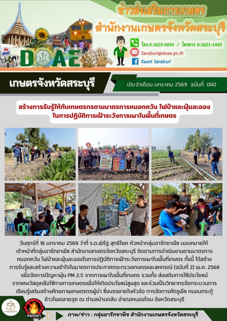 วันศุกร์ที่ 16 มกราคม 2569 ว่าที่ ร.ต.พิรัฐ สุทธิโยค หัวหน้ากลุ่มอารักขาพืช มอบหมายให้ เจ้าหน้าที่กลุ่มอารักขาพืช สำนักงานเกษตรจังหวัดสระบุรี ติดตามการดำเนินงานตามมาตรการหมอกควัน ไฟป่าและฝุ่นละอองในการปฏิบัติการเฝ้าระวังการเผาในพื้นที่เกษตร ทั้งนี้ ได้สร้างการรับรู้และสร้างความเข้าใจในมาตรการประกาศกระทรวงเกษตรและสหกรณ์ (ฉบับที่ 2) พ.ศ. 2568 เพื่อจัดการปัญหาฝุ่น PM 2.5 จากการเผาในพื้นที่เกษตร รวมทั้ง ส่งเสริมการใช้ประโยชน์จากเศษวัสดุเหลือใช้ทางการเกษตรเพื่อให้เกิดประโยชน์สูงสุด และร่วมเป็นวิทยากรจัดกระบวนการเรียนรู้เสริมสร้างศักยภาพเกษตรกรผู้นำ ซึ่งบรรยายในหัวข้อ การจัดการศัตรูพืช หนอนกระทู้ข้าวโพดลายจุด ณ ตำบลบ้านกลับ อำเภอหนองโดน จังหวัดสระบุรี