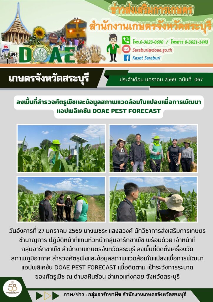 วันอังคารที่ 27 มกราคม 2569 นางพชระ แสงสวงค์ นักวิชาการส่งเสริมการเกษตรชำนาญการ ปฏิบัติหน้าที่แทนหัวหน้ากลุ่มอารักขาพืช พร้อมด้วย เจ้าหน้าที่กลุ่มอารักขาพืช สำนักงานเกษตรจังหวัดสระบุรี ลงพื้นที่ติดตั้งเครื่องวัดสภาพภูมิอากาศ สำรวจศัตรูพืชและข้อมูลสภาพแวดล้อมในแปลงเพื่อการพัฒนาแอปพลิเคชัน DOAE PEST FORECAST เพื่อติดตาม เฝ้าระวังการระบาดของศัตรูพืช ณ ตำบลหินซ้อน อำเภอแก่งคอย จังหวัดสระบุรี