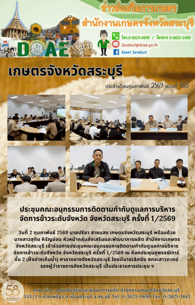 วันที่ 2 กุมภาพันธ์ 2569 นายปรีชา สายแสง เกษตรจังหวัดสระบุรี พร้อมด้วยนางสาวสุทิน หิรัญอ่อน หัวหน้ากลุ่มส่งเสริมและพัฒนาการผลิต สำนักงานเกษตรจังหวัดสระบุรี เข้าร่วมการประชุมคณะอนุกรรมการติดตามกำกับดูแลการบริหารจัดการข้าวระดับจังหวัด จังหวัดสระบุรี ครั้งที่ 1/2569 ณ ห้องประชุมสุพรรณิการ์ ชั้น 2 (ฝั่งอ่างเก็บน้ำ) ศาลากลางจังหวัดสระบุรี โดยมีนายเลิศชัย สกลเสาวภาคย์ รองผู้ว่าราชการจังหวัดสระบุรี เป็นประธานการประชุม ฯ