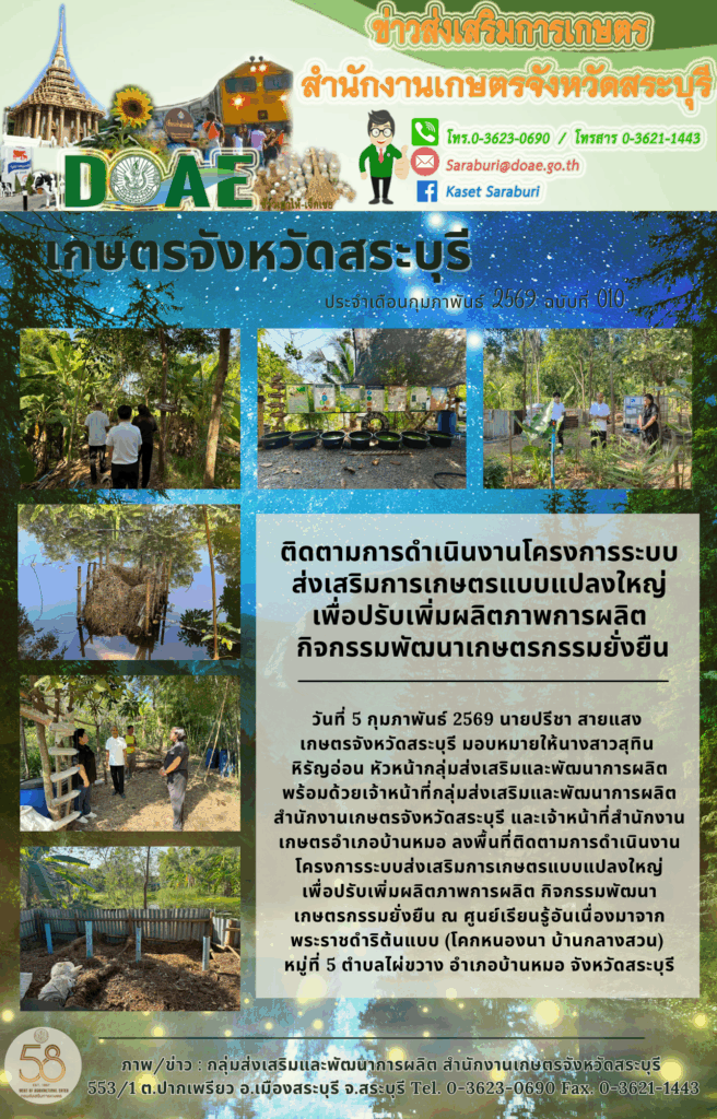 วันที่ 5 กุมภาพันธ์ 2569 นายปรีชา สายแสง เกษตรจังหวัดสระบุรี มอบหมายให้นางสาวสุทิน หิรัญอ่อน หัวหน้ากลุ่มส่งเสริมและพัฒนาการผลิต พร้อมด้วยเจ้าหน้าที่กลุ่มส่งเสริมและพัฒนาการผลิต สำนักงานเกษตรจังหวัดสระบุรี และเจ้าหน้าที่สำนักงานเกษตรอำเภอบ้านหมอ ลงพื้นที่ติดตามการดำเนินงานโครงการระบบส่งเสริมการเกษตรแบบแปลงใหญ่เพื่อปรับเพิ่มผลิตภาพการผลิต กิจกรรมพัฒนาเกษตรกรรมยั่งยืน ณ ศูนย์เรียนรู้อันเนื่องมาจากพระราชดำริต้นแบบ (โคกหนองนา บ้านกลางสวน) หมู่ที่ 5 ตำบลไผ่ขวาง อำเภอบ้านหมอ จังหวัดสระบุรี