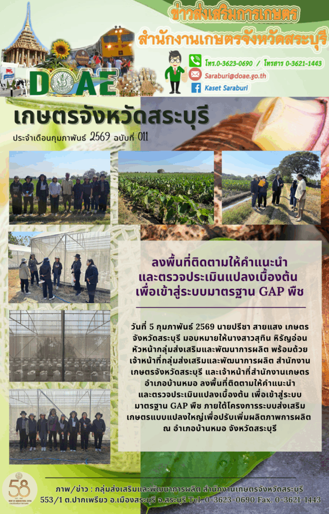 วันที่ 5 กุมภาพันธ์ 2569 นายปรีชา สายแสง เกษตรจังหวัดสระบุรี มอบหมายให้นางสาวสุทิน หิรัญอ่อน หัวหน้ากลุ่มส่งเสริมและพัฒนาการผลิต พร้อมด้วย