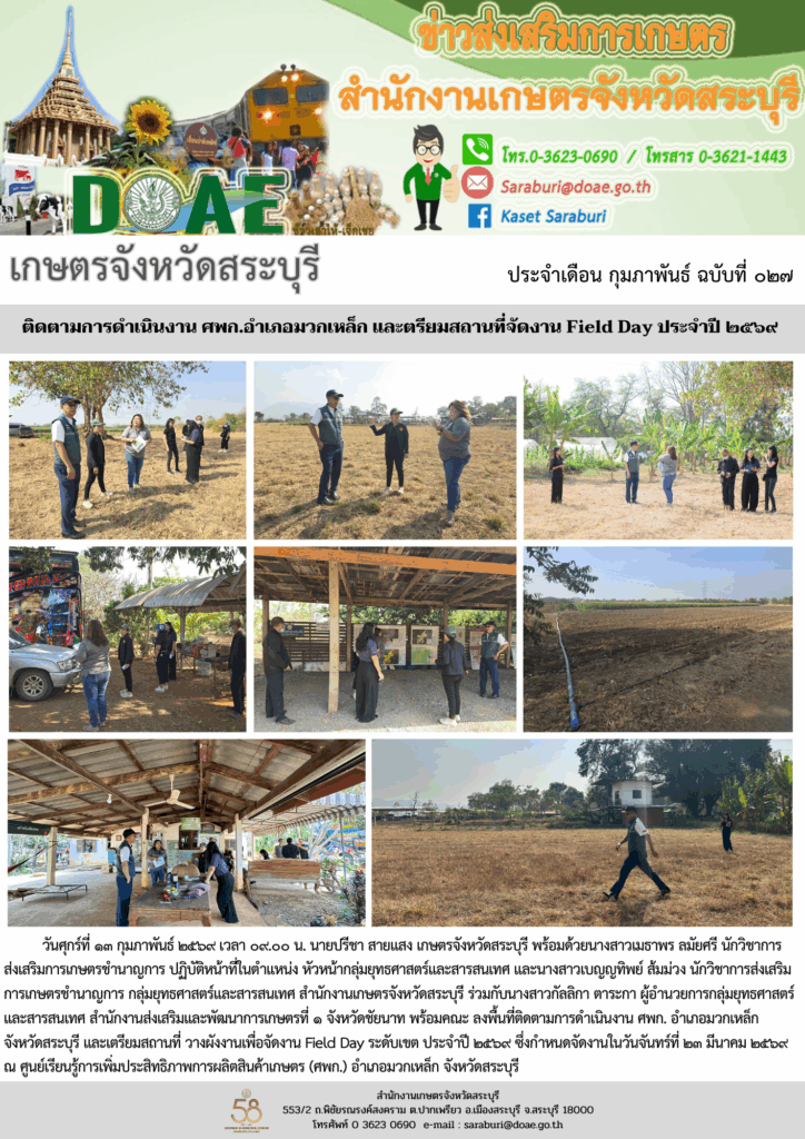 วันศุกร์ที่ ๑๓ กุมภาพันธ์ ๒๕๖๙ เวลา ๐๙.๐๐ น. นายปรีชา สายแสง เกษตรจังหวัดสระบุรี พร้อมด้วยนางสาวเมธาพร ลมัยศรี นักวิชาการ ส่งเสริมการเกษตรชำนาญการ ปฏิบัติหน้าที่ในตำแหน่ง หัวหน้ากลุ่มยุทธศาสตร์และสารสนเทศ และนางสาวเบญญทิพย์ ส้มม่วง นักวิชาการส่งเสริมการเกษตรชำนาญการ กลุ่มยุทธศาสตร์และสารสนเทศ สำนักงานเกษตรจังหวัดสระบุรี ร่วมกับนางสาวกัลลิกา ตาระกา ผู้อำนวยการกลุ่มยุทธศาสตร์และสารสนเทศ สำนักงานส่งเสริมและพัฒนาการเกษตรที่ ๑ จังหวัดชัยนาท พร้อมคณะ ลงพื้นที่ติดตามการดำเนินงาน ศพก. อำเภอมวกเหล็ก จังหวัดสระบุรี และเตรียมสถานที่ วางผังงานเพื่อจัดงาน Field Day ระดับเขต ประจำปี ๒๕๖๙ ซึ่งกำหนดจัดงานในวันจันทร์ที่ ๒๓ มีนาคม ๒๕๖๙ ณ ศูนย์เรียนรู้การเพิ่มประสิทธิภาพการผลิตสินค้าเกษตร (ศพก.) อำเภอมวกเหล็ก จังหวัดสระบุรี