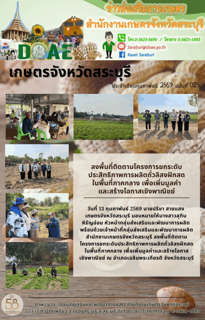 วันที่ 13 กุมภาพันธ์ 2569 นายปรีชา สายแสง เกษตรจังหวัดสระบุรี มอบหมายให้นางสาวสุทิน หิรัญอ่อน หัวหน้ากลุ่มส่งเสริมและพัฒนาการผลิต พร้อมด้วยเจ้าหน้าที่กลุ่มส่งเสริมและพัฒนาการผลิต สำนักงานเกษตรจังหวัดสระบุรี ลงพื้นที่ติดตามโครงการยกระดับประสิทธิภาพการผลิตถั่วลิสงฝักสดในพื้นที่ภาคกลาง เพื่อเพิ่มมูลค่าและสร้างโอกาสเชิงพาณิชย์ ณ อำเภอเฉลิมพระเกียรติ จังหวัดสระบุรี