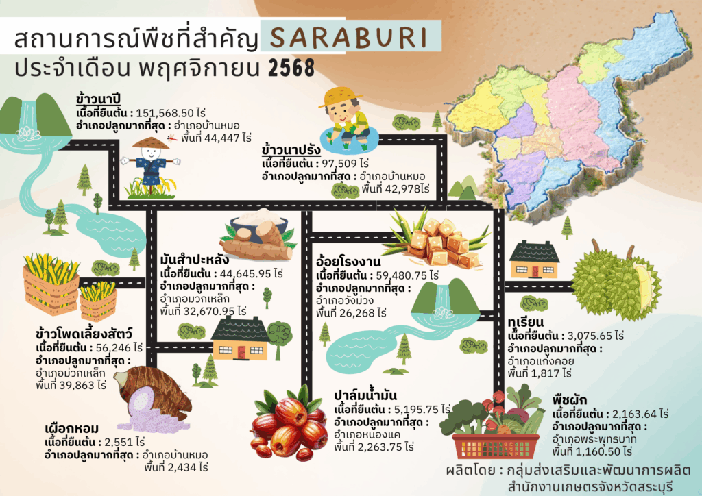 สถานการณ์พืชที่สำคัญ ของจังหวัดสระบุรี ประจำเดือนพฤศจิกายน 2568By กลุ่มส่งเสริมและพัฒนาการผลิต / 16/11/2025