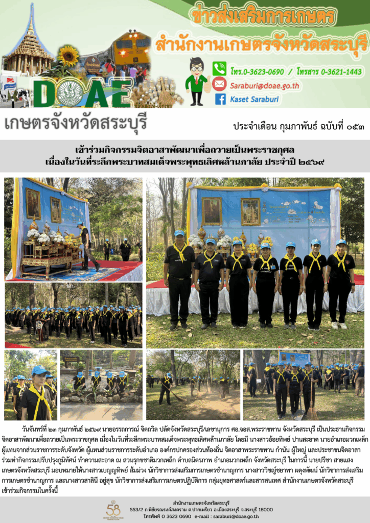 วันจันทร์ที่ ๒๓ กุมภาพันธ์ ๒๕๖๙ นายอรรถการณ์ จิตถวิล ปลัดจังหวัดสระบุรี/เลขานุการ ศอ.จอส.พระราชทาน จังหวัดสระบุรี เป็นประธานกิจกรรมจิตอาสาพัฒนาเพื่อถวายเป็นพระราชกุศล เนื่องในวันที่ระลึกพระบาทสมเด็จพระพุทธเลิศหล้านภาลัย โดยมี นางสาวอ้อยทิพย์ ปานสะอาด นายอำเภอมวกเหล็ก ผู้แทนจากส่วนราชการระดับจังหวัด ผู้แทนส่วนราชการระดับอำเภอ องค์กรปกครองส่วนท้องถิ่น จิตอาสาพระราชทาน กำนัน ผู้ใหญ่ และประชาชนจิตอาสา ร่วมทำกิจกรรมปรับปรุงภูมิทัศน์ ทำความสะอาด ณ สวนรุกขชาติมวกเหล็ก ตำบลมิตรภาพ อำเภอมวกเหล็ก จังหวัดสระบุรี ในการนี้ นายปรีชา สายแสง เกษตรจังหวัดสระบุรี มอบหมายให้นางสาวเบญญทิพย์ ส้มม่วง นักวิชาการส่งเสริมการเกษตรชำนาญการ นางสาววิชญ์ชยาพา ผดุงพัฒน์ นักวิชาการส่งเสริมการเกษตรชำนาญการ และนางสาวสาลินี อยู่สุข นักวิชาการส่งเสริมการเกษตรปฏิบัติการ กลุ่มยุทธศาสตร์และสารสนเทศ สำนักงานเกษตรจังหวัดสระบุรี เข้าร่วมกิจกรรมในครั้งนี้