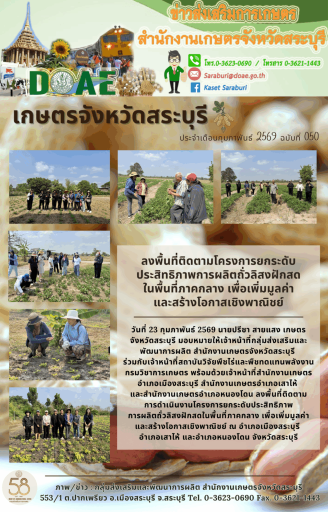 วันที่ 23 กุมภาพันธ์ 2569 นายปรีชา สายแสง เกษตรจังหวัดสระบุรี มอบหมายให้เจ้าหน้าที่กลุ่มส่งเสริมและพัฒนาการผลิต สำนักงานเกษตรจังหวัดสระบุรี ร่วมกับเจ้าหน้าที่สถาบันวิจัยพืชไร่และพืชทดแทนพลังงาน กรมวิชาการเกษตร พร้อมด้วยเจ้าหน้าที่สำนักงานเกษตรอำเภอเมืองสระบุรี สำนักงานเกษตรอำเภอเสาไห้ และสำนักงานเกษตรอำเภอหนองโดน ลงพื้นที่ติดตามการดำเนินงานโครงการยกระดับประสิทธิภาพการผลิตถั่วลิสงฝักสดในพื้นที่ภาคกลาง เพื่อเพิ่มมูลค่าและสร้างโอกาสเชิงพาณิชย์ ณ อำเภอเมืองสระบุรี อำเภอเสาไห้ และอำเภอหนองโดน จังหวัดสระบุรี