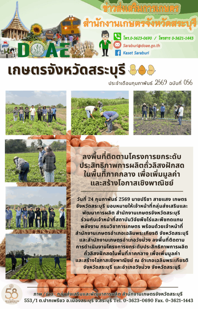 วันที่ 24 กุมภาพันธ์ 2569 นายปรีชา สายแสง เกษตรจังหวัดสระบุรี มอบหมายให้เจ้าหน้าที่กลุ่มส่งเสริมและพัฒนาการผลิต สำนักงานเกษตรจังหวัดสระบุรี ร่วมกับเจ้าหน้าที่สถาบันวิจัยพืชไร่และพืชทดแทนพลังงาน กรมวิชาการเกษตร พร้อมด้วยเจ้าหน้าที่สำนักงานเกษตรอำเภอเฉลิมพระเกียรติ จังหวัดสระบุรี และสำนักงานเกษตรอำเภอวังม่วง ลงพื้นที่ติดตามการดำเนินงานโครงการยกระดับประสิทธิภาพการผลิตถั่วลิสงฝักสดในพื้นที่ภาคกลาง เพื่อเพิ่มมูลค่าและสร้างโอกาสเชิงพาณิชย์ ณ อำเภอเฉลิมพระเกียรติจังหวัดสระบุรี และอำเภอวังม่วง จังหวัดสระบุรี