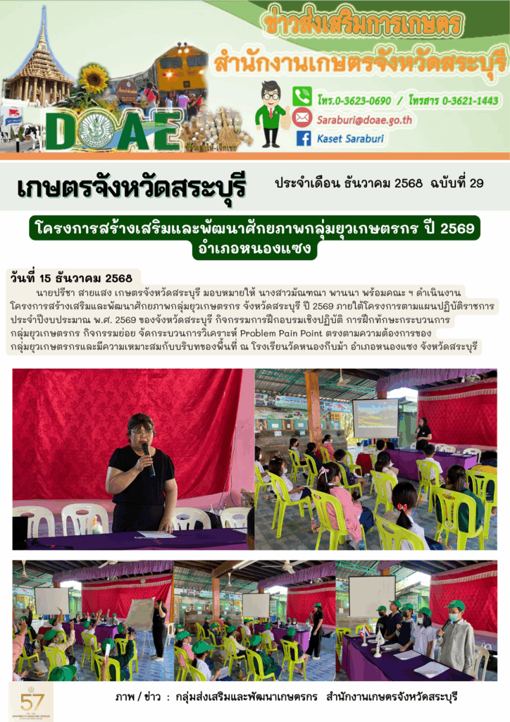 นายปรีชา สายแสง เกษตรจังหวัดสระบุรี มอบหมายให้ นางสาวมัณฑณา พานนา พร้อมคณะ ฯ ดำเนินงาน โครงการสร้างเสริมและพัฒนาศักยภาพกลุ่มยุวเกษตรกร จังหวัดสระบุรี ปี 2569 ภายใต้โครงการตามแผนปฏิบัติราชการ ประจำปีงบประมาณ พ.ศ. 2569 ของจังหวัดสระบุรี กิจกรรมการฝึกอบรมเชิงปฏิบัติ การฝึกทักษะกระบวนการกลุ่มยุวเกษตรกร กิจกรรมย่อย จัดกระบวนการวิเคราะห์ Problem Pain Point ตรงตามความต้องการของกลุ่มยุวเกษตรกรและมีความเหมาะสมกับบริบทของพื้นที่ ณ โรงเรียนวัดหนองกีบม้า อำเภอหนองแซง จังหวัดสระบุรี