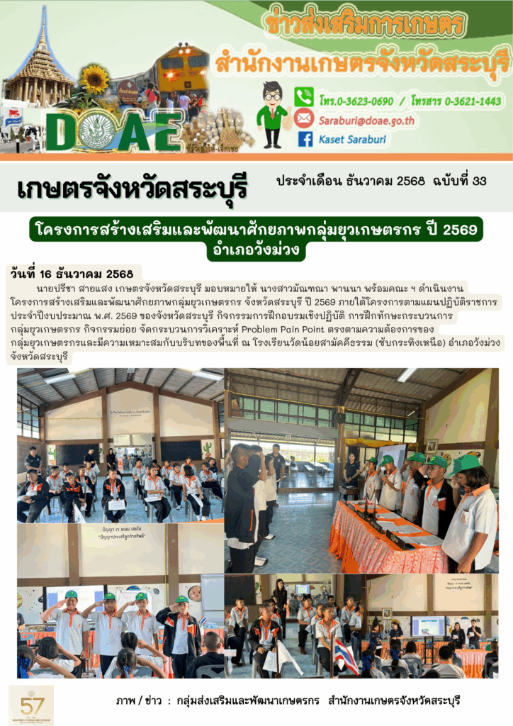นายปรีชา สายแสง เกษตรจังหวัดสระบุรี มอบหมายให้ นางสาวมัณฑณา พานนา พร้อมคณะ ฯ ดำเนินงานโครงการสร้างเสริมและพัฒนาศักยภาพกลุ่มยุวเกษตรกร จังหวัดสระบุรี ปี 2569 ภายใต้โครงการตามแผนปฏิบัติราชการประจำปีงบประมาณ พ.ศ. 2569 ของจังหวัดสระบุรี กิจกรรมการฝึกอบรมเชิงปฏิบัติ การฝึกทักษะกระบวนการกลุ่มยุวเกษตรกร กิจกรรมย่อย จัดกระบวนการวิเคราะห์ Problem Pain Point ตรงตามความต้องการของกลุ่มยุวเกษตรกรและมีความเหมาะสมกับบริบทของพื้นที่ ณ โรงเรียนวัดน้อยสามัคีธรรม (ซับกระทิงเหนือ) อำเภอวังม่วง จังหวัดสระบุรี