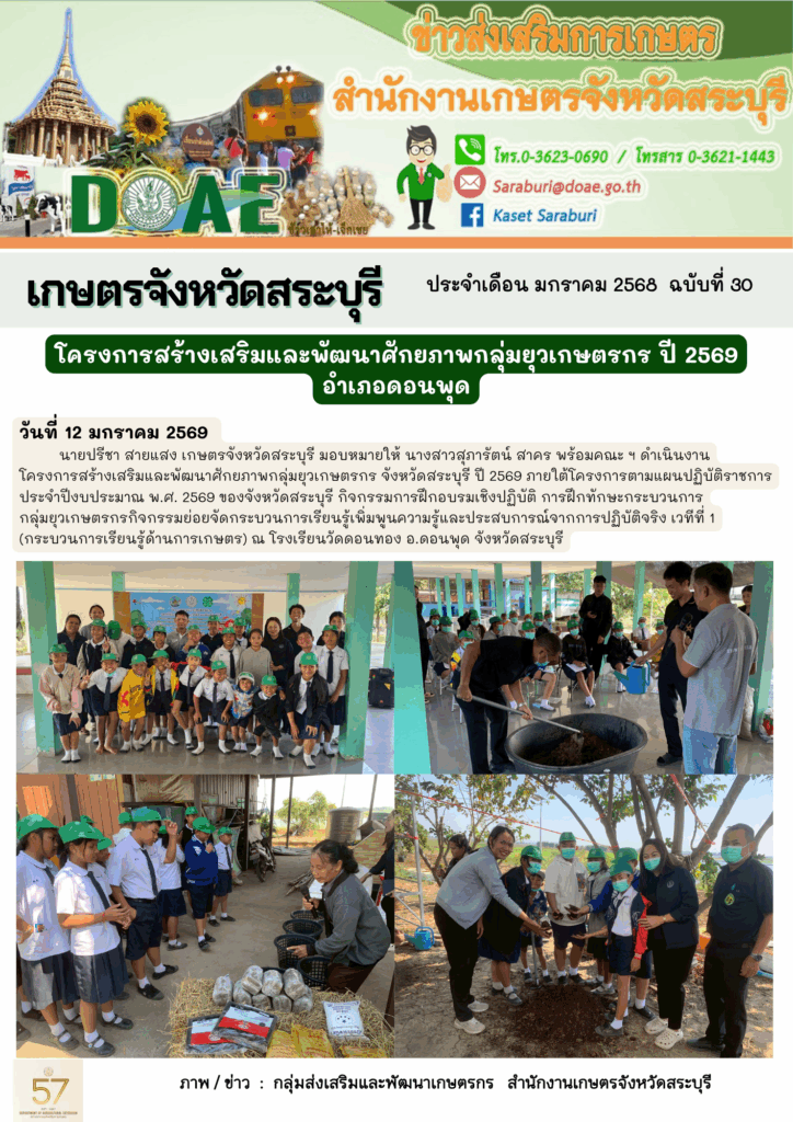 นายปรีชา สายแสง เกษตรจังหวัดสระบุรี มอบหมายให้ นางสาวสุภารัตน์ สาคร พร้อมคณะ ฯดำเนินงานโครงการสร้างเสริมและพัฒนาศักยภาพกลุ่มยุวเกษตรกร จังหวัดสระบุรี ปี 2569 ภายใต้โครงการตามแผนปฏิบัติราชการประจำปีงบประมาณ พ.ศ. 2569 ของจังหวัดสระบุรีกิจกรรมการฝึกอบรมเชิงปฏิบัติการฝึกทักษะกระบวนการกลุ่มยุวเกษตรกรกิจกรรมย่อยจัดกระบวนการเรียนรู้เพิ่มพูนความรู้และประสบการณ์จากการปฏิบัติจริง เวทีที่ 1 (กระบวนการเรียนรู้ด้านการเกษตร) ณ โรงเรียนวัดดอนทอง อ.ดอนพุด จังหวัดสระบุรี