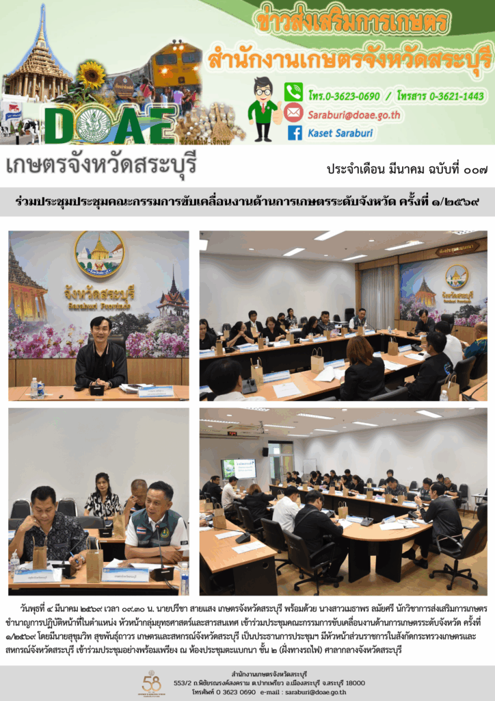 วันพุธที่ ๔ มีนาคม ๒๕๖๙ เวลา ๐๙.๓๐ น. นายปรีชา สายแสง เกษตรจังหวัดสระบุรี พร้อมด้วย นางสาวเมธาพร ลมัยศรี นักวิชาการส่งเสริมการเกษตรชำนาญการปฏิบัติหน้าที่ในตำแหน่ง หัวหน้ากลุ่มยุทธศาสตร์และสารสนเทศ เข้าร่วมประชุมคณะกรรมการขับเคลื่อนงานด้านการเกษตรระดับจังหวัด ครั้งที่ ๑/๒๕๖๙ โดยมีนายสุขุมวิท สุขพันธุ์ถาวร เกษตรและสหกรณ์จังหวัดสระบุรี เป็นประธานการประชุมฯ มีหัวหน้าส่วนราชการในสังกัดกระทรวงเกษตรและสหกรณ์จังหวัดสระบุรี เข้าร่วมประชุมอย่างพร้อมเพรียง ณ ห้องประชุมตะแบกนา ชั้น ๒ (ฝั่งทางรถไฟ) ศาลากลางจังหวัดสระบุรี