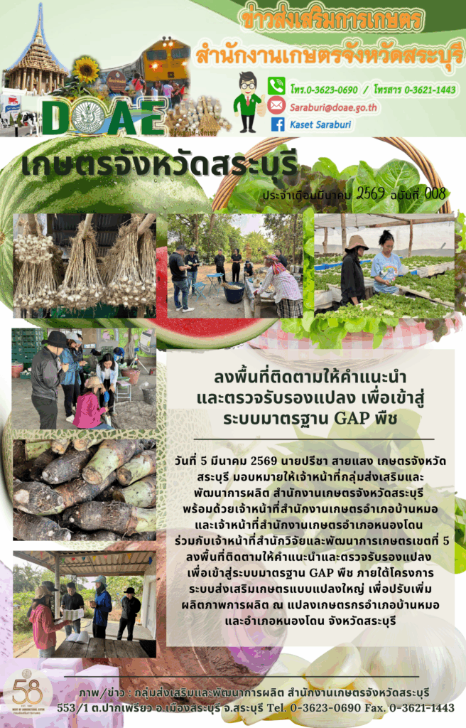 วันที่ 5 มีนาคม 2569 นายปรีชา สายแสง เกษตรจังหวัดสระบุรี มอบหมายให้เจ้าหน้าที่กลุ่มส่งเสริมและพัฒนาการผลิต สำนักงานเกษตรจังหวัดสระบุรี พร้อมด้วยเจ้าหน้าที่สำนักงานเกษตรอำเภอบ้านหมอ และเจ้าหน้าที่สำนักงานเกษตรอำเภอหนองโดน ร่วมกับเจ้าหน้าที่สำนักวิจัยและพัฒนาการเกษตรเขตที่ 5 ลงพื้นที่ติดตามให้คำแนะนำและตรวจรับรองแปลง เพื่อเข้าสู่ระบบมาตรฐาน GAP พืช ภายใต้โครงการระบบส่งเสริมเกษตรแบบแปลงใหญ่ เพื่อปรับเพิ่มผลิตภาพการผลิต ณ แปลงเกษตรกรอำเภอบ้านหมอ และอำเภอหนองโดน จังหวัดสระบุรี