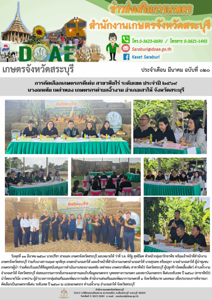 วันพุธที่ ๑๑ มีนาคม ๒๕๖๙ นายปรีชา สายแสง เกษตรจังหวัดสระบุรี มอบหมายให้ ว่าที่ ร.ต. พิรัฐ สุทธิโยค หัวหน้ากลุ่มอารักขาพืช พร้อมเจ้าหน้าที่สำนักงานเกษตรจังหวัดสระบุรี ร่วมกับนางสาวนฤมล พุกพิกุล เกษตรอำเภอเสาไห้ และเจ้าหน้าที่สำนักงานเกษตรอำเภอเสาไห้ นายสุรเดช สร้อยอุทา นายอำเภอเสาไห้ ผู้นำชุมชน เกษตรกรผู้นำ ร่วมต้อนรับและให้ข้อมูลสนับสนุนการดำเนินงานของนางณหทัย เหล่าทอง เกษตรกรดีเด่น สาขาพืชไร่ จังหวัดสระบุรี ผู้ปลูกข้าวโพดเลี้ยงสัตว์ ตำบลงิ้วงาม อำเภอเสาไห้ จังหวัดสระบุรี ต่อคณะกรรมการกลั่นกรองเอกสารและเก็บข้อมูลเกษตรกร บุคคลทางการเกษตร และสถาบันเกษตรกร ดีเด่นระดับเขต ปี ๒๕๖๙ (สาขาพืชไร่) นำโดยนายวินัย นาคปาน ผู้อำนวยการกลุ่มส่งเสริมและพัฒนาการผลิต สำนักงานส่งเสริมและพัฒนาการเกษตรที่ ๑ จังหวัดชัยนาท และคณะ เพื่อประกอบการพิจารณาคัดเลือกเป็นเกษตรกรดีเด่น ระดับเขต ปี ๒๕๖๙ ณ แปลงเกษตรกร ตำบลงิ้วงาม อำเภอเสาไห้ จังหวัดสระบุรี