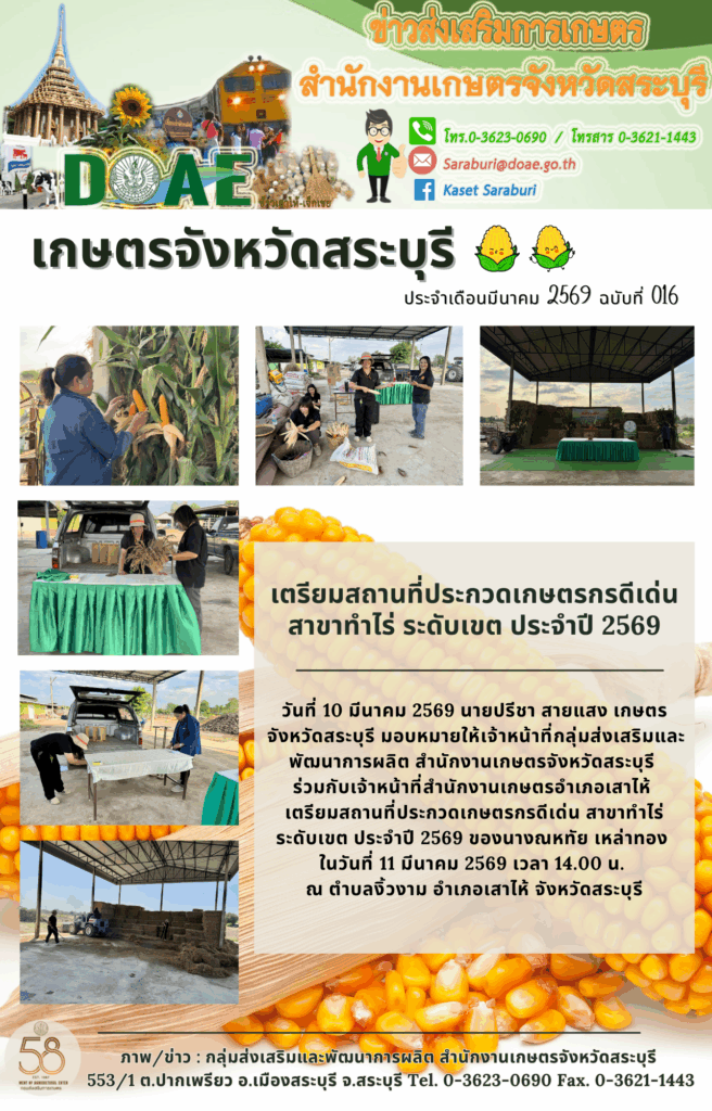 วันที่ 10 มีนาคม 2569 นายปรีชา สายแสง เกษตรจังหวัดสระบุรี มอบหมายให้เจ้าหน้าที่กลุ่มส่งเสริมและพัฒนาการผลิต สำนักงานเกษตรจังหวัดสระบุรี ร่วมกับเจ้าหน้าที่สำนักงานเกษตรอำเภอเสาไห้ เตรียมสถานที่ประกวดเกษตรกรดีเด่น สาขาทำไร่ ระดับเขต ประจำปี 2569 ของนางณหทัย เหล่าทอง โดยมีกำหนดจัดการประกวดฯ ในวันที่ 11 มีนาคม 2569 เวลา 14.00 น. ณ ตำบลงิ้วงาม อำเภอเสาไห้ จังหวัดสระบุรี