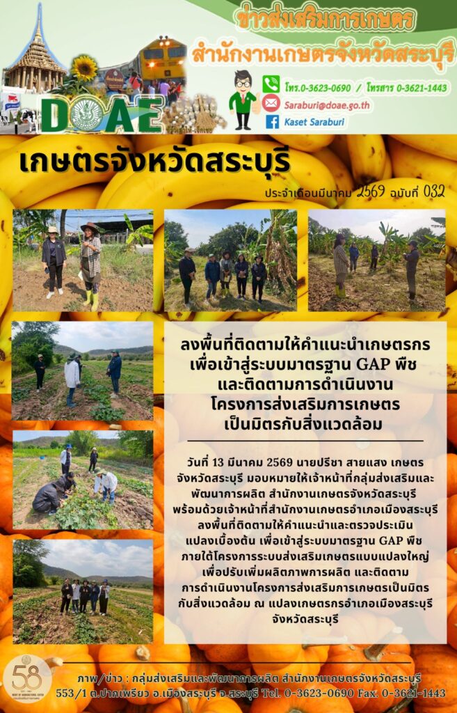 วันที่ 13 มีนาคม 2569 นายปรีชา สายแสง เกษตรจังหวัดสระบุรี มอบหมายให้เจ้าหน้าที่กลุ่มส่งเสริมและพัฒนาการผลิต สำนักงานเกษตรจังหวัดสระบุรี พร้อมด้วยเจ้าหน้าที่สำนักงานเกษตรอำเภอเมืองสระบุรี ลงพื้นที่ติดตามให้คำแนะนำและตรวจประเมินแปลงเบื้องต้น เพื่อเข้าสู่ระบบมาตรฐาน GAP พืช ภายใต้โครงการระบบส่งเสริมเกษตรแบบแปลงใหญ่เพื่อปรับเพิ่มผลิตภาพการผลิต และติดตามการดำเนินงานโครงการส่งเสริมการเกษตรเป็นมิตรกับสิ่งแวดล้อม ณ แปลงเกษตรกรอำเภอเมืองสระบุรี จังหวัดสระบุร