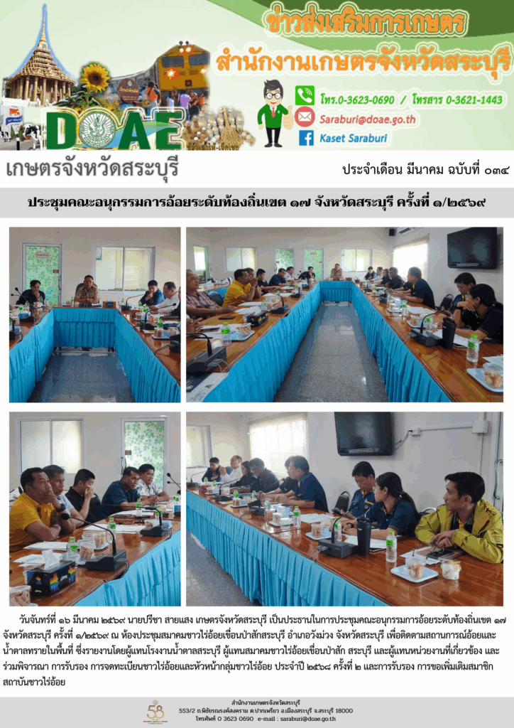 วันจันทร์ที่ ๑๖ มีนาคม ๒๕๖๙ นายปรีชา สายแสง เกษตรจังหวัดสระบุรี เป็นประธานในการประชุมคณะอนุกรรมการอ้อยระดับท้องถิ่นเขต ๑๗ จังหวัดสระบุรี ครั้งที่ ๑/๒๕๖๙ ณ ห้องประชุมสมาคมชาวไร่อ้อยเขื่อนป่าสักสระบุรี อำเภอวังม่วง จังหวัดสระบุรี เพื่อติดตามสถานการณ์อ้อยและน้ำตาลทรายในพื้นที่ ซึ่งรายงานโดยผู้แทนโรงงานน้ำตาลสระบุรี ผู้แทนสมาคมชาวไร่อ้อยเขื่อนป่าสัก สระบุรี และผู้แทนหน่วยงานที่เกี่ยวข้อง และร่วมพิจารณา การรับรอง การจดทะเบียนชาวไร่อ้อยและหัวหน้ากลุ่มชาวไร่อ้อย ประจำปี ๒๕๖๘ ครั้งที่ ๒ และการรับรอง การขอเพิ่มเติมสมาชิก สถาบันชาวไร่อ้อย