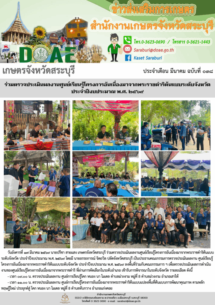 วันอังคารที่ ๑๗ มีนาคม ๒๕๖๙ นายปรีชา สายแสง เกษตรจังหวัดสระบุรี ร่วมตรวจประเมินผลงานศูนย์เรียนรู้โครงการอันเนื่องมาจากพระราชดำริต้นแบบระดับจังหวัด ประจำปีงบประมาณ พ.ศ. ๒๕๖๙ โดยมี นายอรรถการณ์ จิตถวิล ปลัดจังหวัดสระบุรี เป็นประธานคณะกรรมการตรวจประเมินผลงาน ศูนย์เรียนรู้โครงการอันเนื่องมาจากพระราชดำริต้นแบบระดับจังหวัด ประจำปีงบประมาณ พ.ศ. ๒๕๖๙ ลงพื้นที่ร่วมกับคณะกรรมการ ฯ เพื่อตรวจประเมินผลการดำเนินงานของศูนย์เรียนรู้โครงการอันเนื่องมาจากพระราชดำริ ที่ผ่านการคัดเลือกในระดับอำเภอ เข้ารับการพิจารณาในระดับจังหวัด รายละเอียด ดังนี้