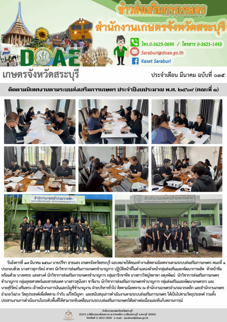 วันอังคารที่ ๑๗ มีนาคม ๒๕๖๙ นายปรีชา สายแสง เกษตรจังหวัดสระบุรี มอบหมายให้คณะทำงานติดตามนิเทศงานตามระบบส่งเสริมการเกษตร คณะที่ ๑ ประกอบด้วย นางสาวสุภารัตน์ สาคร นักวิชาการส่งเสริมการเกษตรชำนาญการ ปฏิบัติหน้าที่ในตำแหน่งหัวหน้ากลุ่มส่งเสริมและพัฒนาการผลิต หัวหน้าทีม พร้อมด้วย นางพชระ แสงสวงค์ นักวิชาการส่งเสริมการเกษตรชำนาญการ กลุ่มอารักขาพืช นางสาววิชญ์ชยาพา ผดุงพัฒน์ นักวิชาการส่งเสริมการเกษตรชำนาญการ กลุ่มยุทธศาสตร์และสารสนเทศ นางสาวสุนันทา ชารีผาบ นักวิชาการส่งเสริมการเกษตรชำนาญการ กลุ่มส่งเสริมและพัฒนาเกษตรกร และ นายสุริรัตน์ เสริมทรง เจ้าพนักงานการเงินและบัญชีชำนาญงาน ฝ่ายบริหารทั่วไป ติดตามนิเทศงาน ณ สำนักงานเกษตรอำเภอมวกเหล็ก และสำนักงานเกษตรอำเภอวังม่วง วัตถุประสงค์เพื่อติดตาม กำกับ แก้ไขปัญหา และสนับสนุนการดำเนินงานตามระบบส่งเสริมการเกษตร ให้เป็นไปตามวัตถุประสงค์ รวมทั้งประสานงานการดำเนินงานในระดับพื้นที่ให้สามารถขับเคลื่อนงานระบบส่งเสริมการเกษตรได้อย่างต่อเนื่องและทันกับสถานการณ์