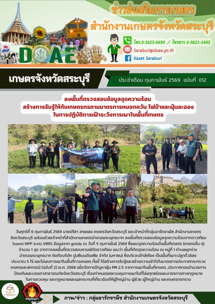 วันศุกร์ที่ 6 กุมภาพันธ์ 2569 นายปรีชา สายแสง เกษตรจังหวัดสระบุรี และเจ้าหน้าที่กลุ่มอารักขาพืช สำนักงานเกษตรจังหวัดสระบุรี พร้อมด้วยเจ้าหน้าที่สำนักงานเกษตรอำเภอพระพุทธบาท ลงพื้นที่ตรวจสอบข้อมูลจุดความร้อนจากดาวเทียม Suomi NPP ระบบ VIIRS ข้อมูลจาก gistda ณ วันที่ 5 กุมภาพันธ์ 2569 ซึ่งพบจุดความร้อนในพื้นทีเกษตร (เกษตรอื่น ๆ) จำนวน 1 จุด จากการลงพื้นที่ตรวจสอบตามพิกัดดาวเทียม พบว่า พื้นที่เกิดจุดความร้อน ณ หมู่ที่ 1 ตำบลพุกร่าง อำเภอพระพุทธบาท ติดกับบริษัท ปูนซีเมนต์เอเซีย จำกัด (มหาชน) ซึ่งบริเวณใกล้เคียง เป็นพื้นที่เพาะปลูกถั่วลิสง ประมาณ 5 ไร่ และไม่พบการเผาในพื้นที่การเกษตร ทั้งนี้ ได้สร้างการรับรู้และสร้างความเข้าใจในมาตรการประกาศกระทรวงเกษตรและสหกรณ์ (ฉบับที่ 2) พ.ศ. 2568 เพื่อจัดการปัญหาฝุ่น PM 2.5 จากการเผาในพื้นที่เกษตร ,ประกาศกองอำนวยการป้องกันและบรรเทาสาธารณภัยจังหวัดสระบุรี เรื่องกำหนดเขตควบคุมการเผาในที่โล่งทุกชนิดและมาตรการทางกฎหมายในการควบคุม และกฎหมายและผลกระทบที่เกี่ยวข้องให้ผู้ใหญ่บ้าน ผู้ช่วย ผู้ใหญ่บ้าน และเกษตรกรทราบ