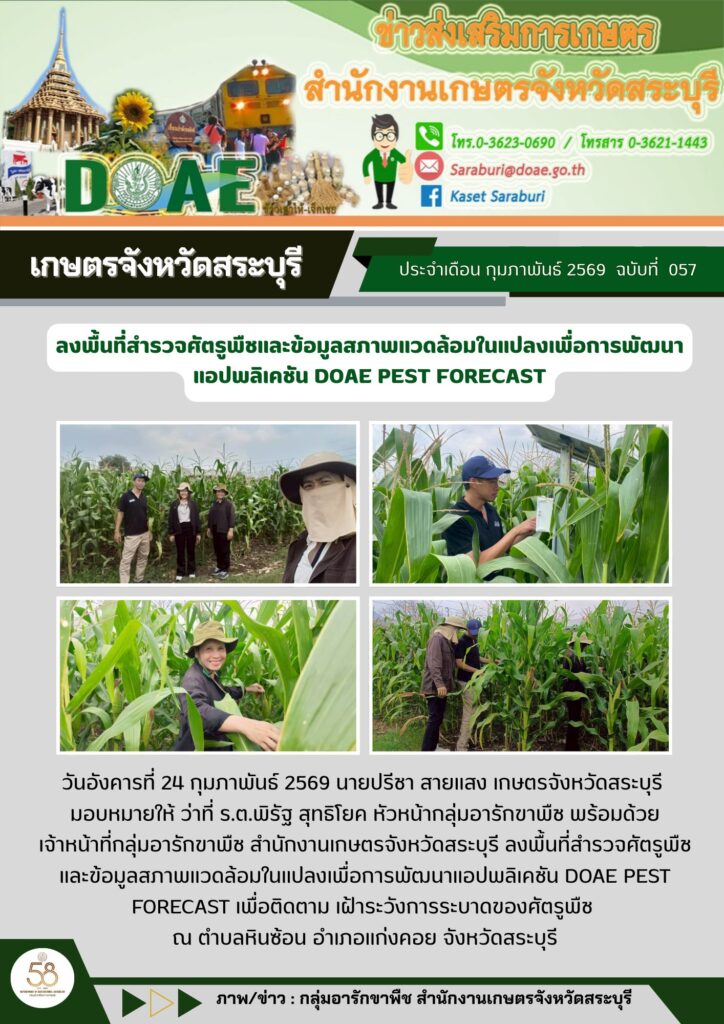 วันอังคารที่ 24 กุมภาพันธ์ 2569 นายปรีชา สายแสง เกษตรจังหวัดสระบุรี มอบหมายให้ ว่าที่ ร.ต.พิรัฐ สุทธิโยค หัวหน้ากลุ่มอารักขาพืช พร้อมด้วยเจ้าหน้าที่กลุ่มอารักขาพืช สำนักงานเกษตรจังหวัดสระบุรี ลงพื้นที่สำรวจศัตรูพืชและข้อมูลสภาพแวดล้อมในแปลงเพื่อการพัฒนาแอปพลิเคชัน DOAE PEST FORECAST เพื่อติดตาม เฝ้าระวังการระบาดของศัตรูพืช ณ ตำบลหินซ้อน อำเภอแก่งคอย จังหวัดสระบุรี
