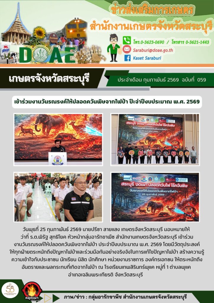 วันพุธที่ 25 กุมภาพันธ์ 2569 นายปรีชา สายแสง เกษตรจังหวัดสระบุรี มอบหมายให้ ว่าที่ ร.ต.พิรัฐ สุทธิโยค หัวหน้ากลุ่มอารักขาพืช สำนักงานเกษตรจังหวัดสระบุรี เข้าร่วมงานวันรณรงค์ให้ปลอดควันพิษจากไฟป่า ประจำปีงบประมาณ พ.ศ. 2569 โดยมีวัตถุประสงค์ให้ทุกฝ่ายตระหนักถึงปัญหาไฟป่าและร่วมมือกันอย่างจริงจังในการแก้ไขปัญหาไฟป่า สร้างความรู้ความเข้าใจกับประชาชน นักเรียน นิสิต นักศึกษา หน่วยงานราชการ องค์กรเอกชน ให้ตระหนักถึงอันตรายและผลกระทบที่เกิดจากไฟป่า ณ โรงเรียนเทพสิรินทร์พุแค หมู่ที่ 1 ตำบลพุแค อำเภอเฉลิมพระเกียรติ จังหวัดสระบุรี