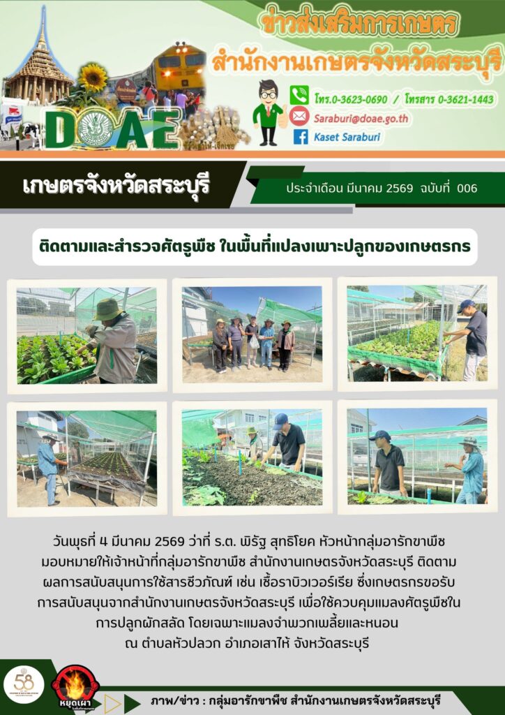 วันพุธที่ 4 มีนาคม 2569 ว่าที่ ร.ต. พิรัฐ สุทธิโยค หัวหน้ากลุ่มอารักขาพืชมอบหมายให้เจ้าหน้าที่กลุ่มอารักขาพืช สำนักงานเกษตรจังหวัดสระบุรี ติดตามผลการสนับสนุนการใช้สารชีวภัณฑ์ เช่น เชื้อราบิวเวอร์เรีย ซึ่งเกษตรกรขอรับการสนับสนุนจากสำนักงานเกษตรจังหวัดสระบุรี เพื่อใช้ควบคุมแมลงศัตรูพืชในการปลูกผักสลัด โดยเฉพาะแมลงจำพวกเพลี้ยและหนอน ณ ตำบลหัวปลวก อำเภอเสาไห้ จังหวัดสระบุรี