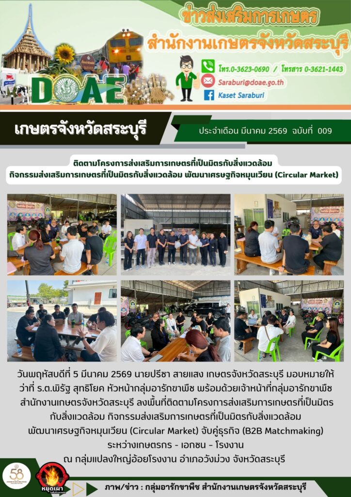 วันพฤหัสบดีที่ 5 มีนาคม 2569 นายปรีชา สายแสง เกษตรจังหวัดสระบุรี มอบหมายให้ ว่าที่ ร.ต.พิรัฐ สุทธิโยค หัวหน้ากลุ่มอารักขาพืช พร้อมด้วยเจ้าหน้าที่กลุ่มอารักขาพืช สำนักงานเกษตรจังหวัดสระบุรี ลงพื้นที่ติดตามโครงการส่งเสริมการเกษตรที่เป็นมิตรกับสิ่งแวดล้อม กิจกรรมส่งเสริมการเกษตรที่เป็นมิตรกับสิ่งแวดล้อม พัฒนาเศรษฐกิจหมุนเวียน (Circular Market) จับคู่ธุรกิจ (B2B Matchmaking) ระหว่างเกษตรกร – เอกชน – โรงงาน ณ กลุ่มแปลงใหญ่อ้อยโรงงาน อำเภอวังม่วง จังหวัดสระบุรี